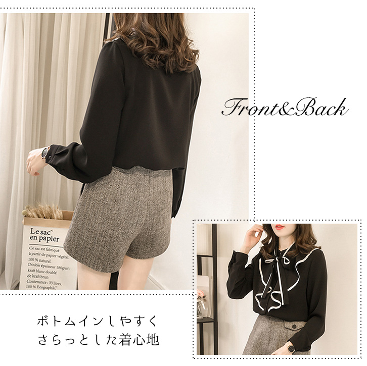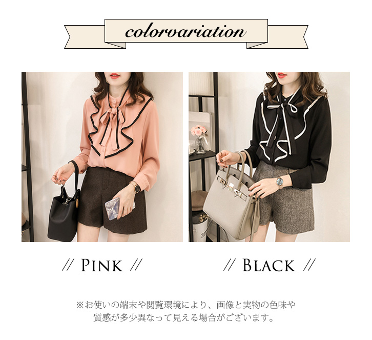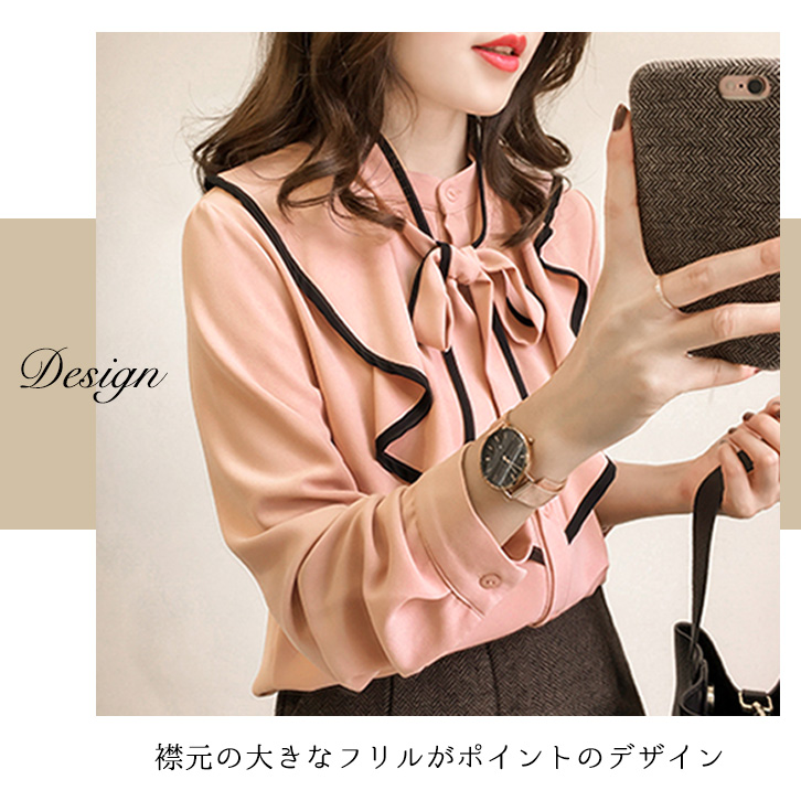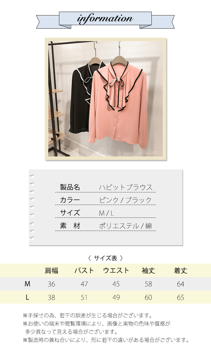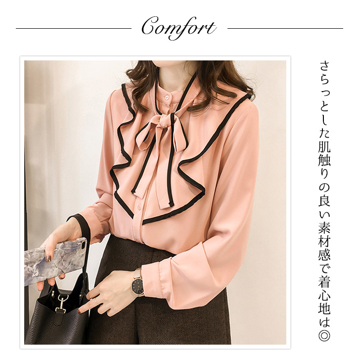 ブラウス レディース 長袖 春 秋 ハビットブラウス リボンブラウス リボン 大人かわいい 上品 エレガント 肌触り抜群 さらっと素材 さらさら 着心地抜群 フリルブラウス フリル 着回し抜群 合わせやすい ピンク ブラック