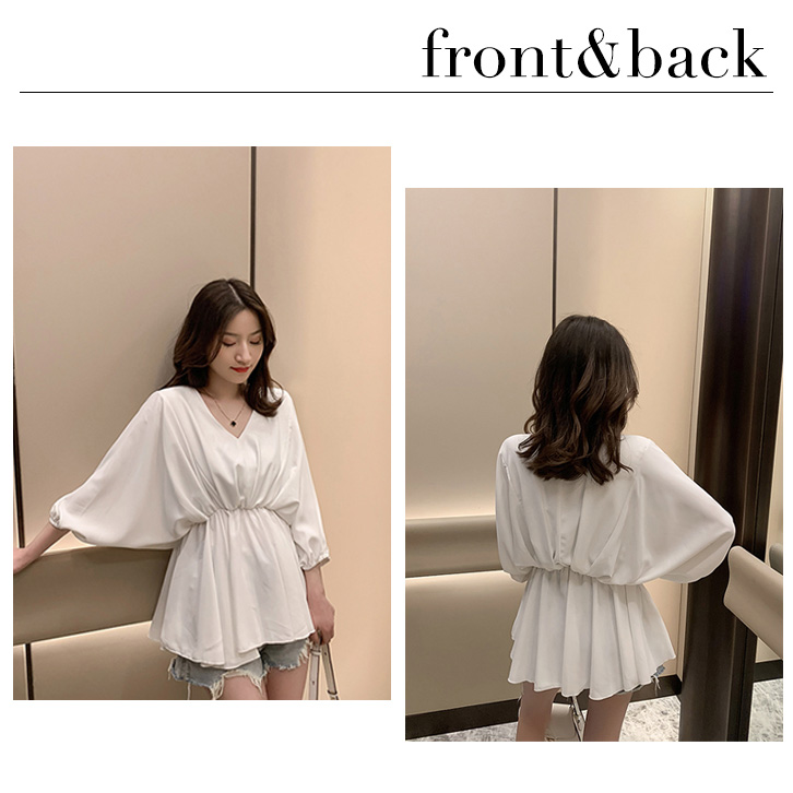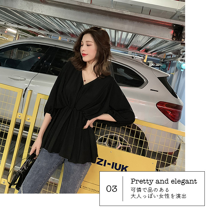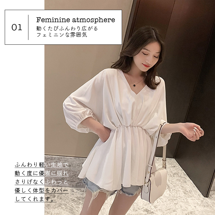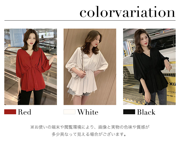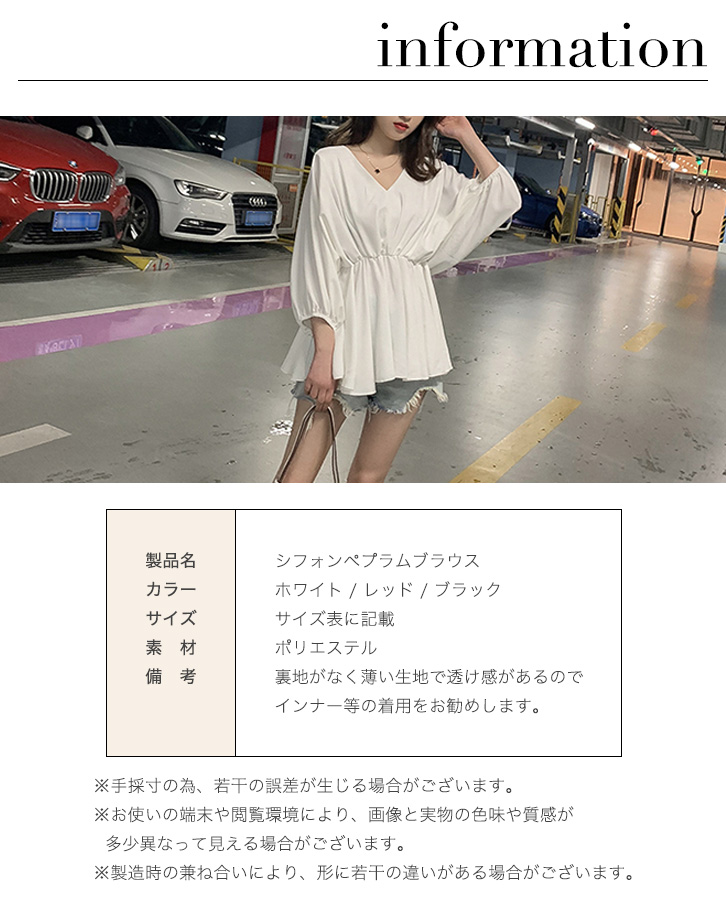 ブラウス レディース 七分袖 春 秋 シフォンペプラムブラウス ペプラムブラウス おしゃれ ふんわり フェミニン 上品 大人かわいい 体型カバー Vネック 美デコルテ きれいめ シンプル 無地 合わせやすい ホワイト レッド ブラック