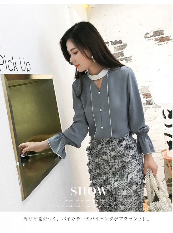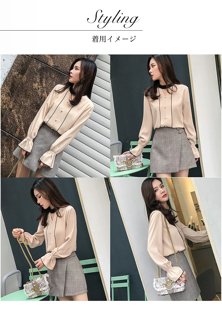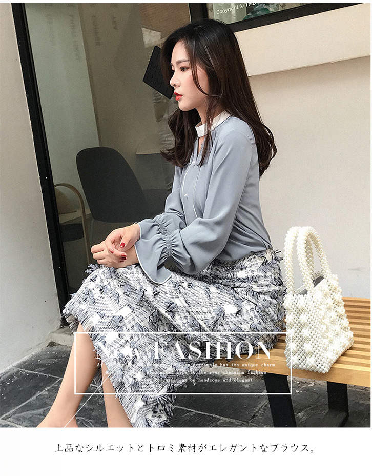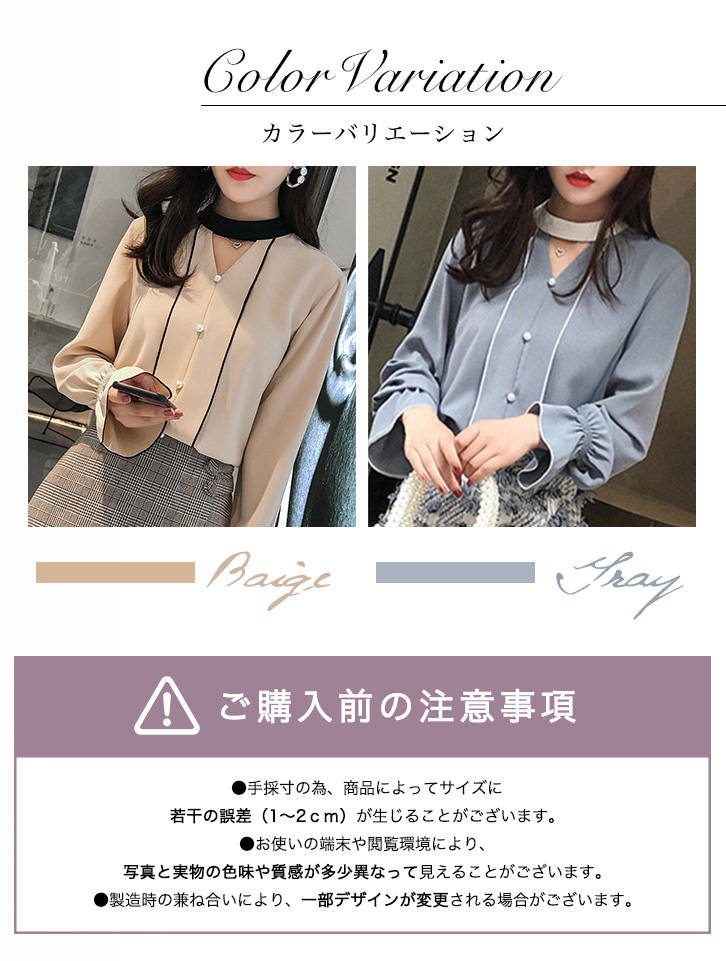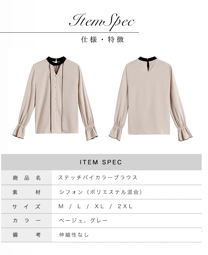 ブラウス レディース 長袖 シフォンブラウス ステッチバイカラーブラウス パールボタン ガーリー フェミニン かわいい キュート 裾フリル 大人かわいい 上品 エレガント とろみ素材 とろみ ベージュ グレー きれいめ シフォン 着心地抜群