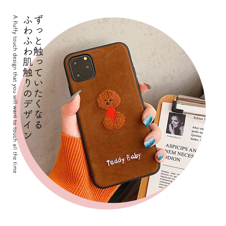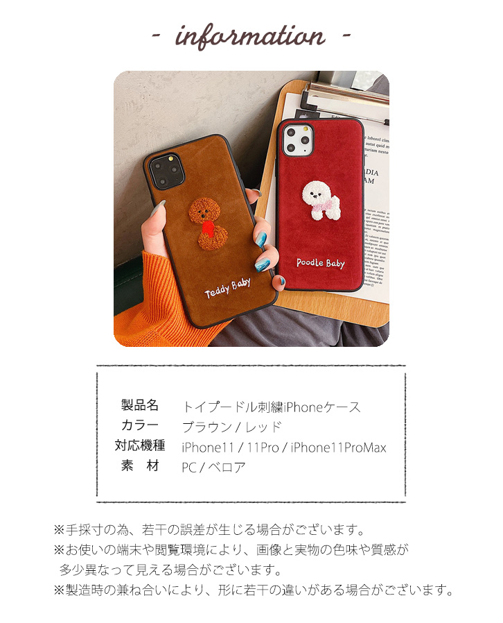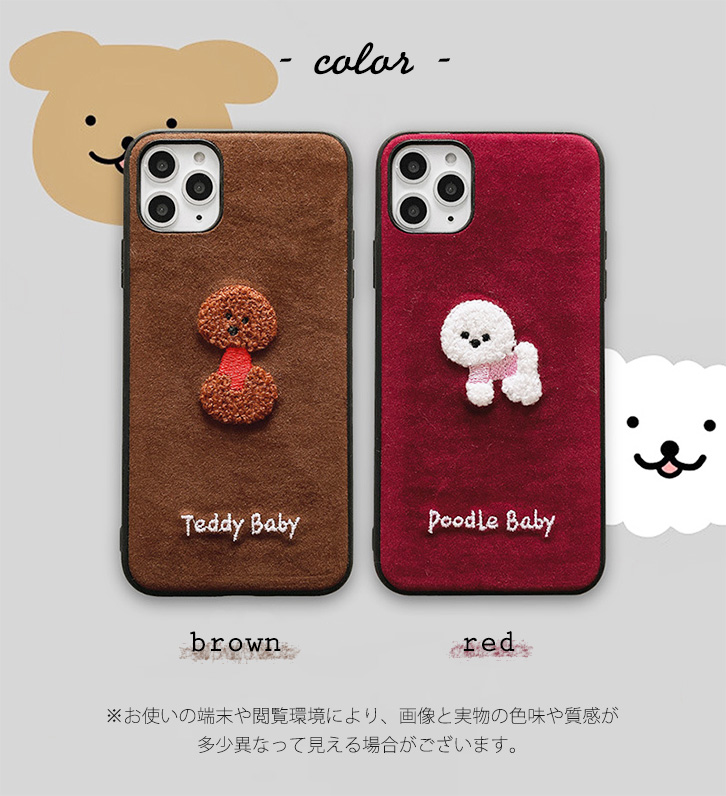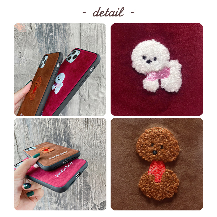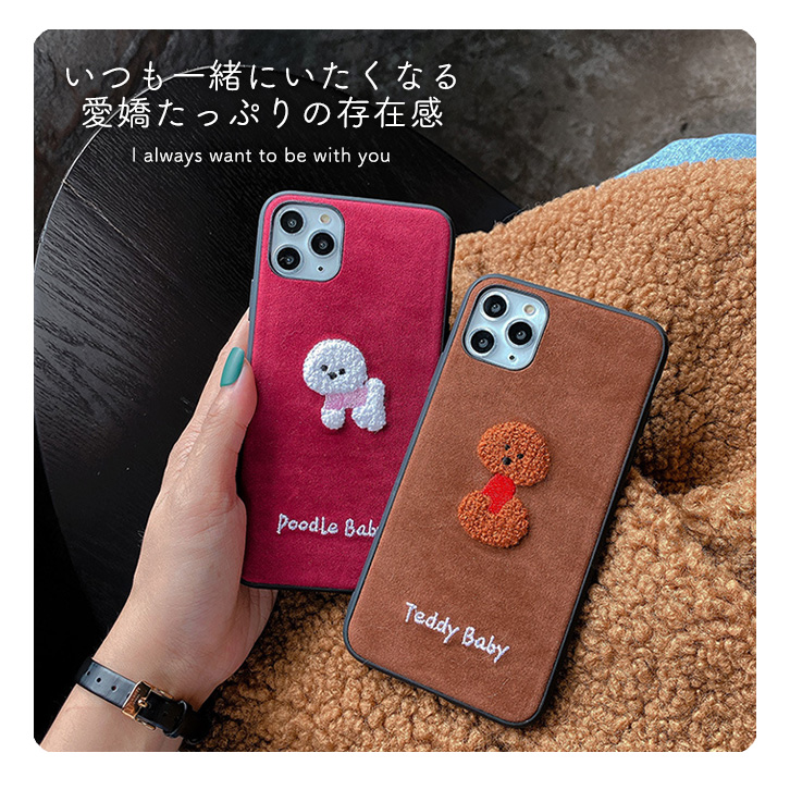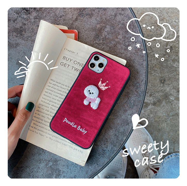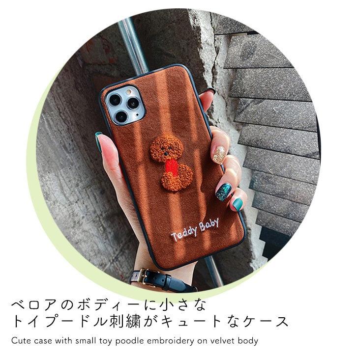 iPhoneケース iPhoneカバー iPhone11 iPhone11Pro iPhone11ProMAX かわいい ワンちゃん 犬 トイプードル ベロア素材 刺繍 キュート おしゃれ シンプル ふわふわ肌触り 癒される ブラウン レッド シンプル