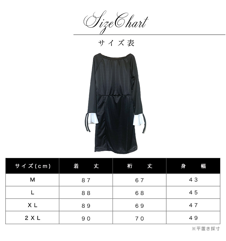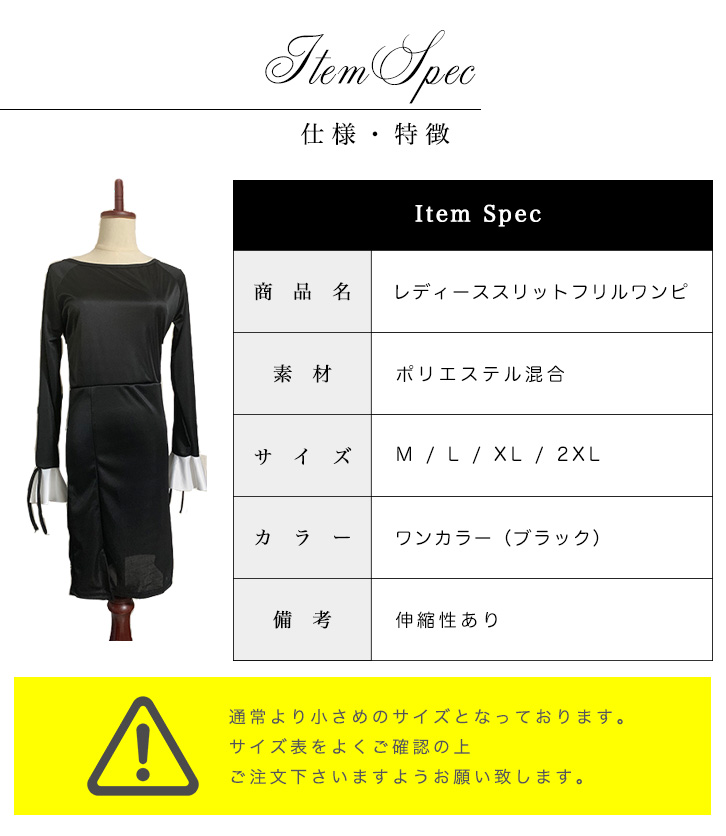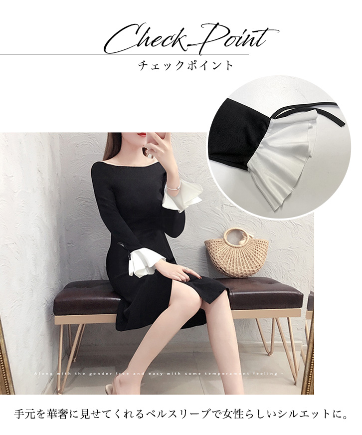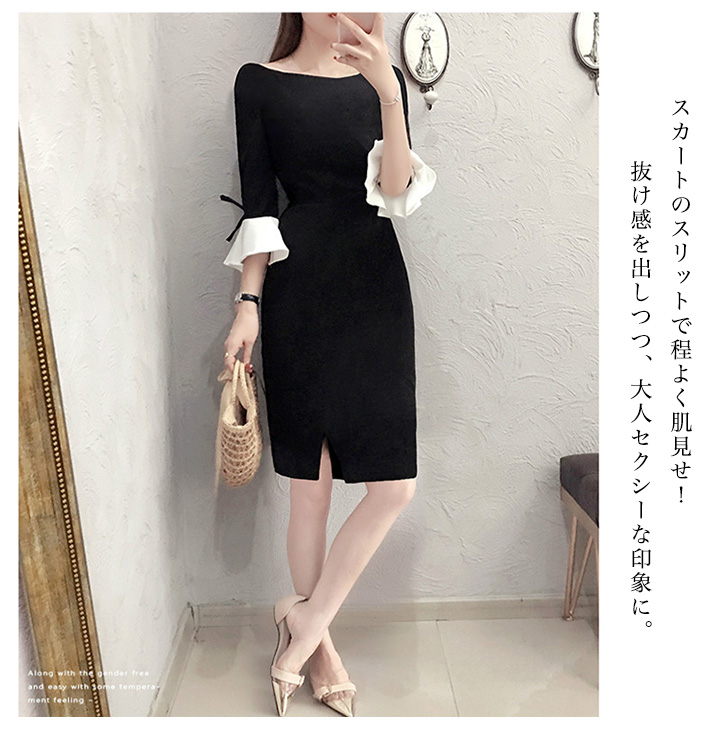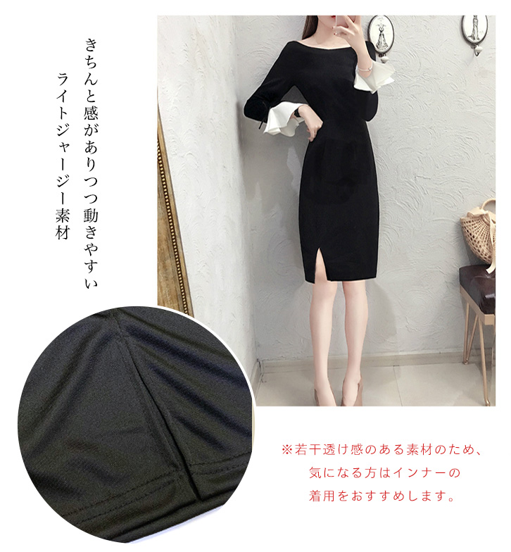 ワンピース レディース 長袖 膝丈 スリット入り フリルワンピース サイズ豊富 ベルスリーブ 上品 大人かわいい きれいめ エレガント 動きやすい 抜け感 大人セクシー ブラック 黒 女性 伸縮性抜群 シンプル