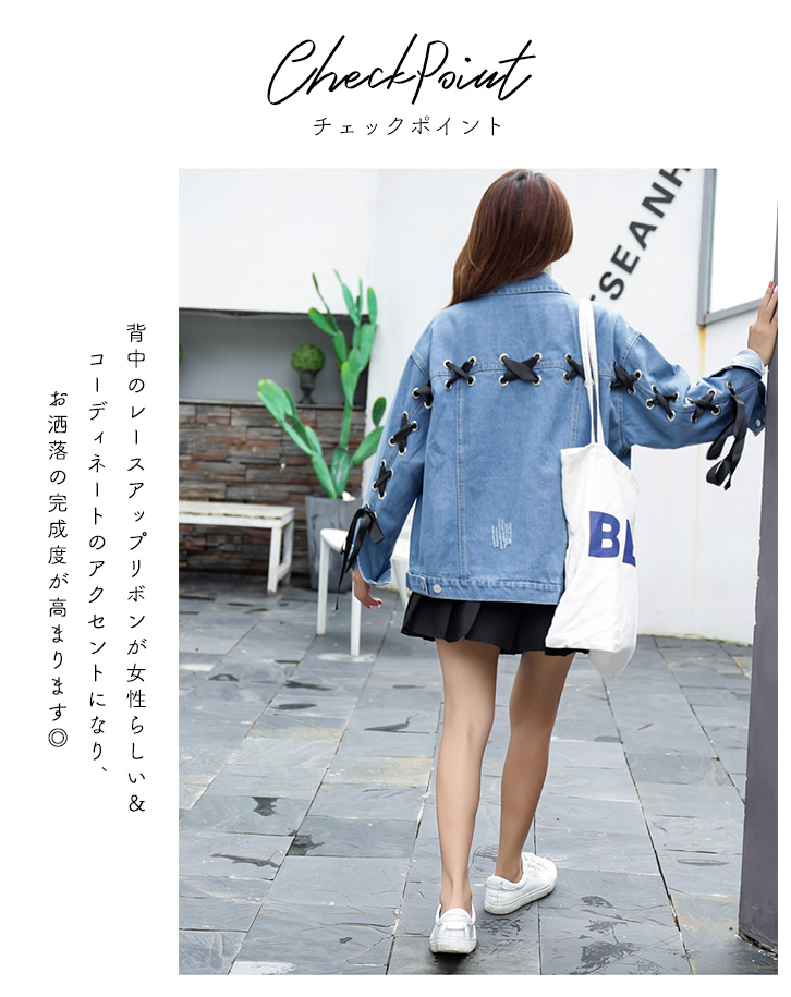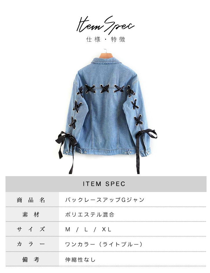 ジャケット レディース デニムジャケット Gジャン バックレースアップ リボン バックリボン 羽織り 秋 春 冬 バックレースアップジャケット レースアップリボン おしゃれ カジュアル ドロップショルダー ガーリー ライトブルー