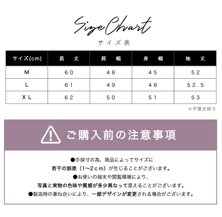 Mサイズ/着丈60、肩幅48、身幅45、袖丈52