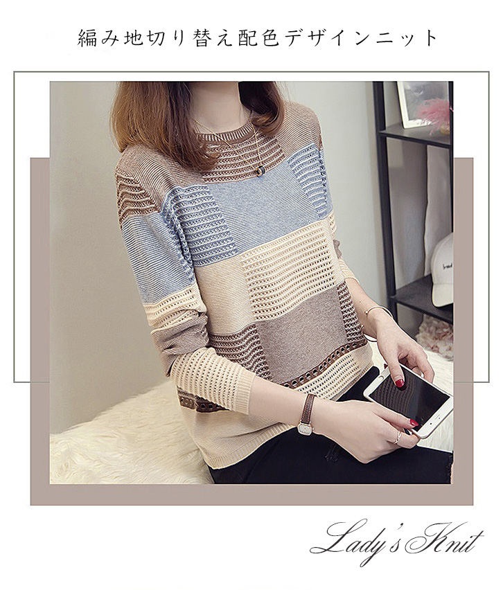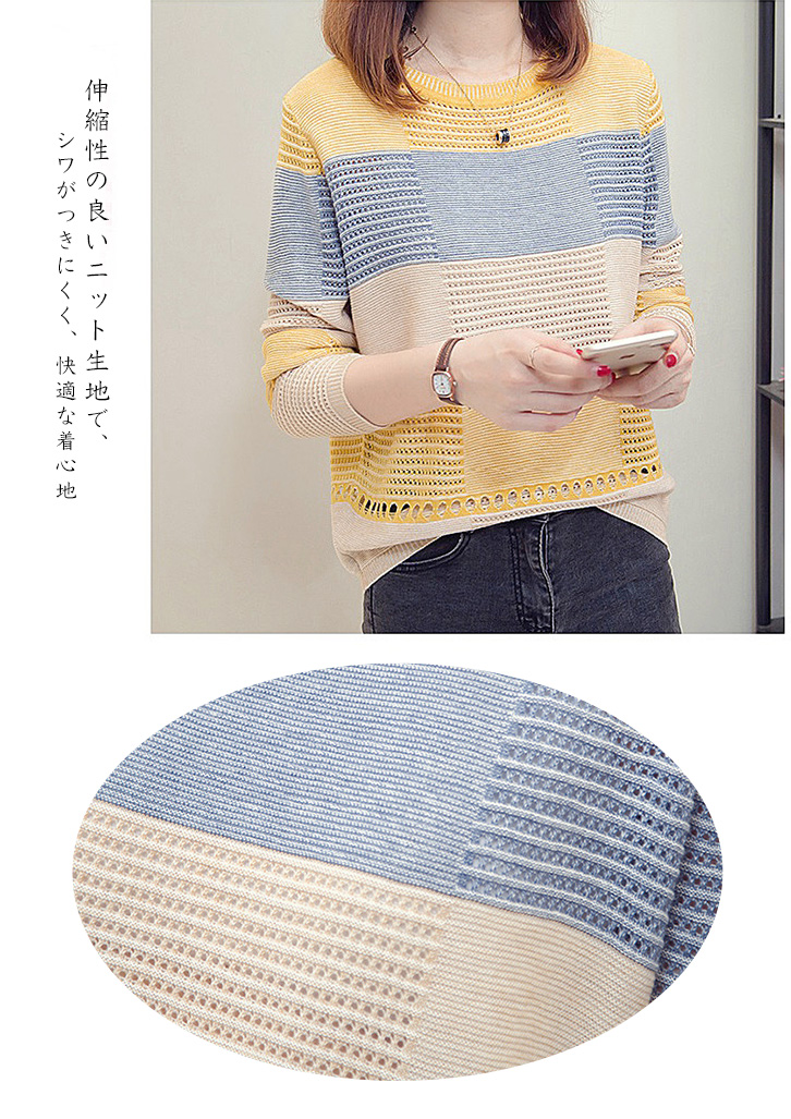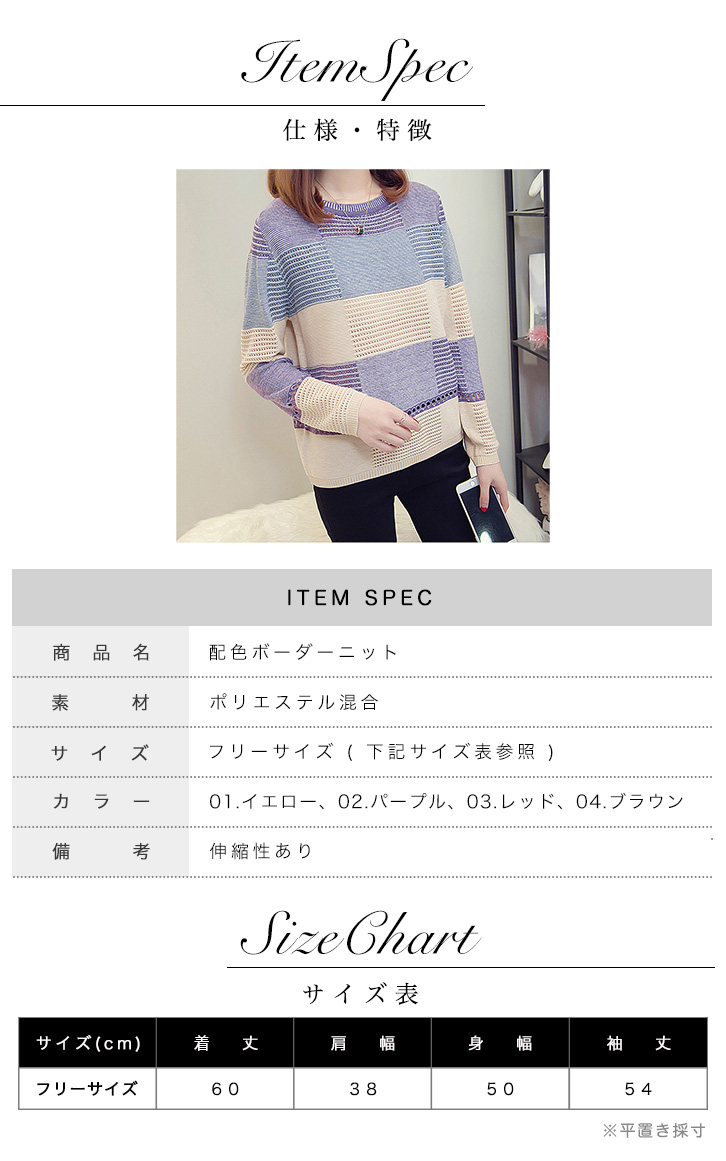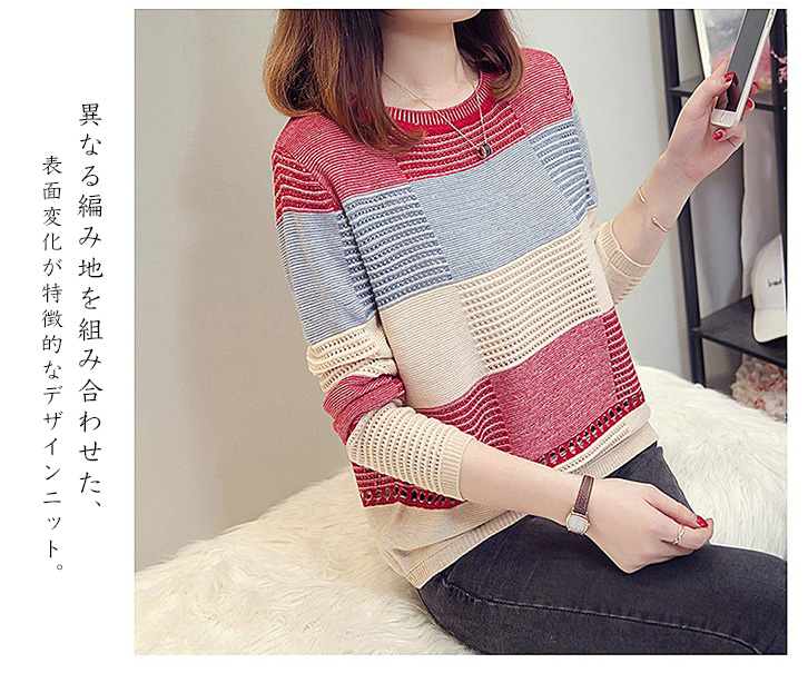 ニット セーター レディース 長袖 配色 ボーダーニット レディースニット 切り替えカラー 配色ボーダー 春 秋 ニットセーター おしゃれ 大人カジュアル 大人かわいい 伸縮性抜群 シワになりにくい 着心地抜群 着心地快適 イエロー パープル レッド ブラウン