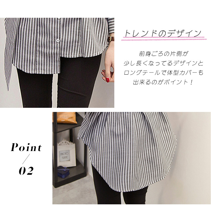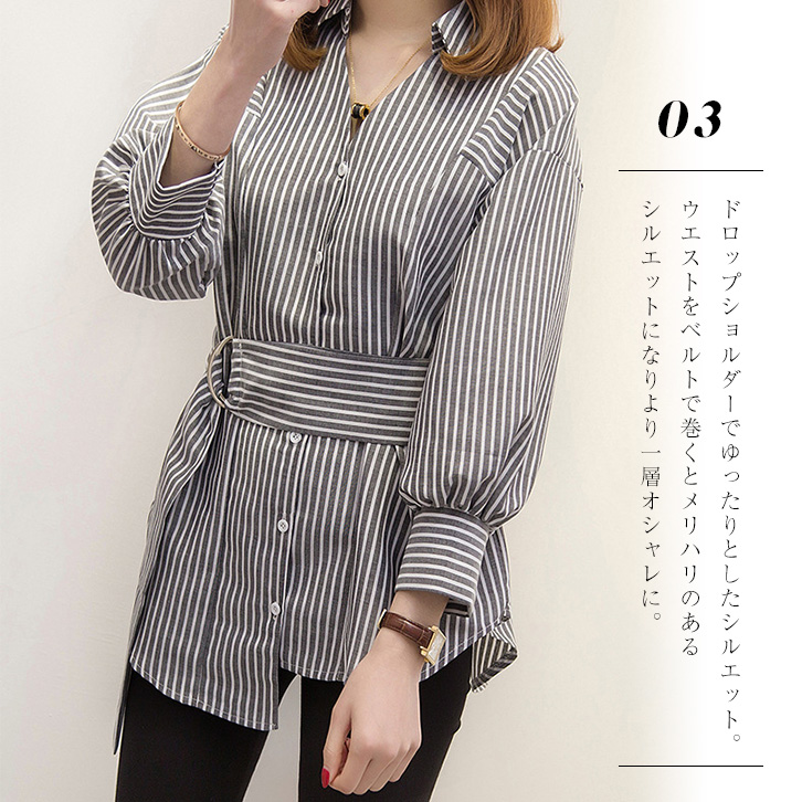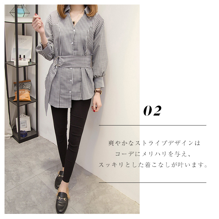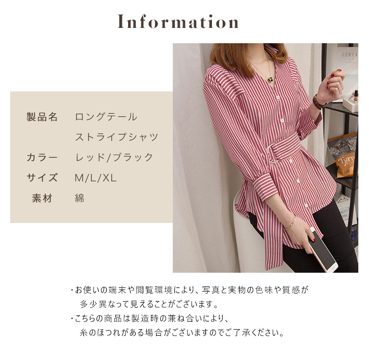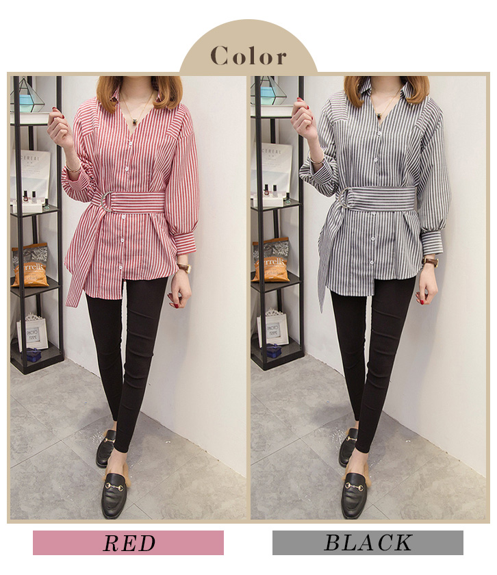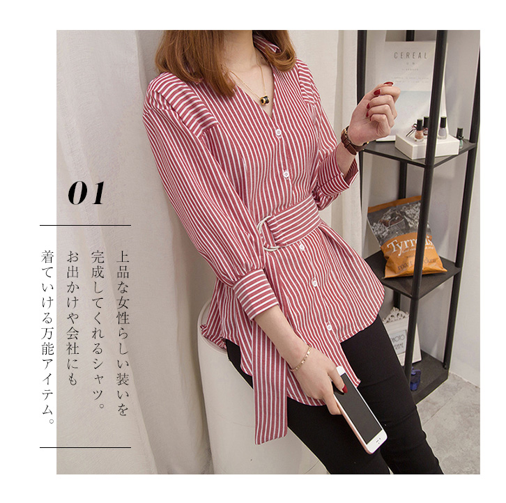 シャツ トップス 長袖 ストライプ レディース ストライプシャツ 上品 ベルト付き デイリー お出かけ オフィス 着回し抜群 ウエストベルト Vネック 体型カバー 美シルエット おしゃれ 大人かわいい レッド ブラック 全2カラー