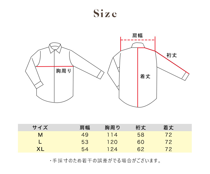 Mサイズ/肩幅49cm、胸囲114cm、袖丈58cm、着丈72cm