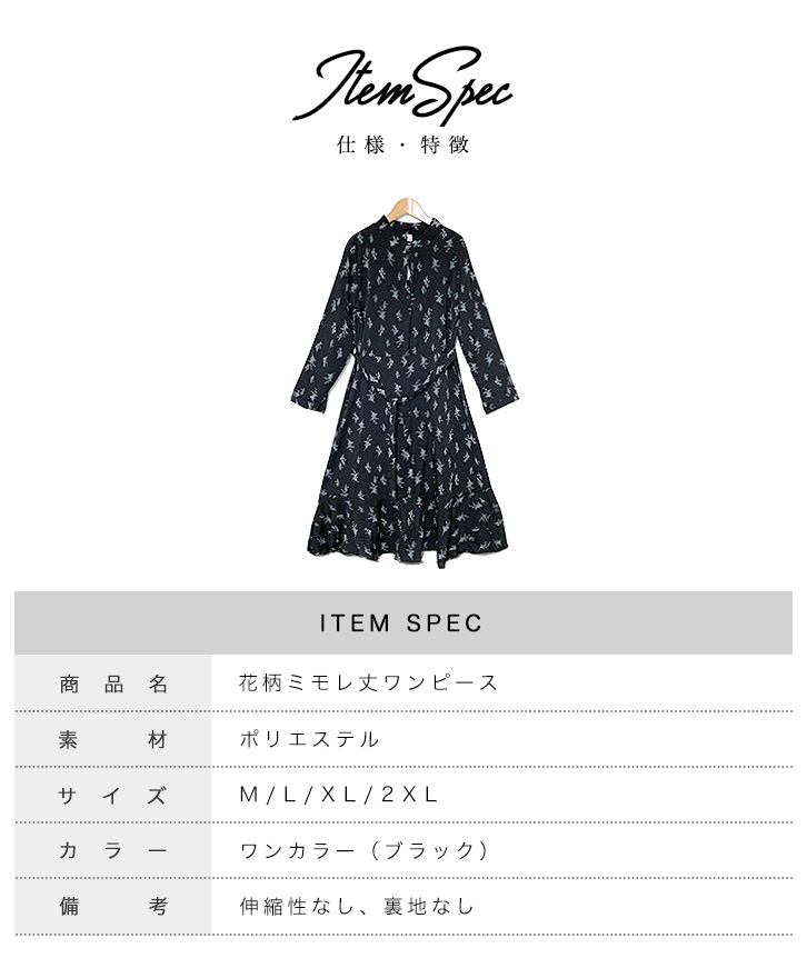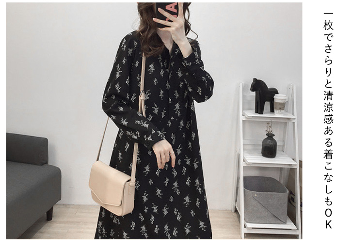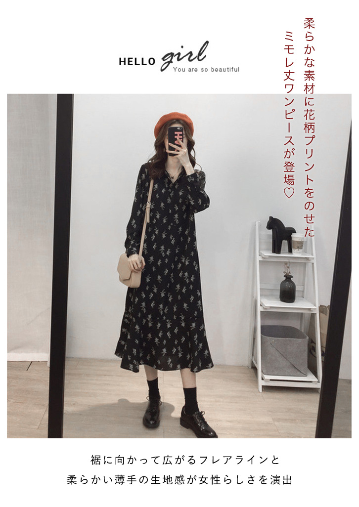ワンピース 長袖 レディース レディースワンピース フレアワンピース レディースワンピ 春 秋 ロングシーズン 膝下丈 ミモレ丈 おしゃれ 可愛い フェミニン 花柄 花 レトロ カジュアル 着回し抜群 シンプル ブラック 大人かわいい