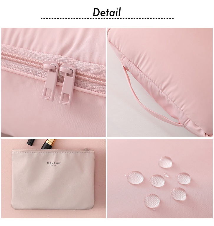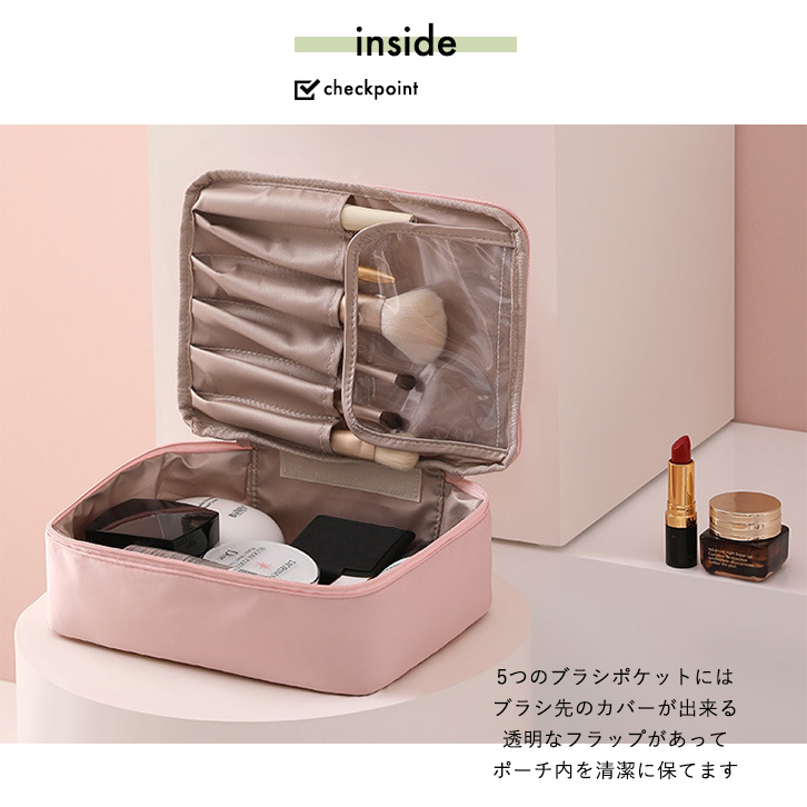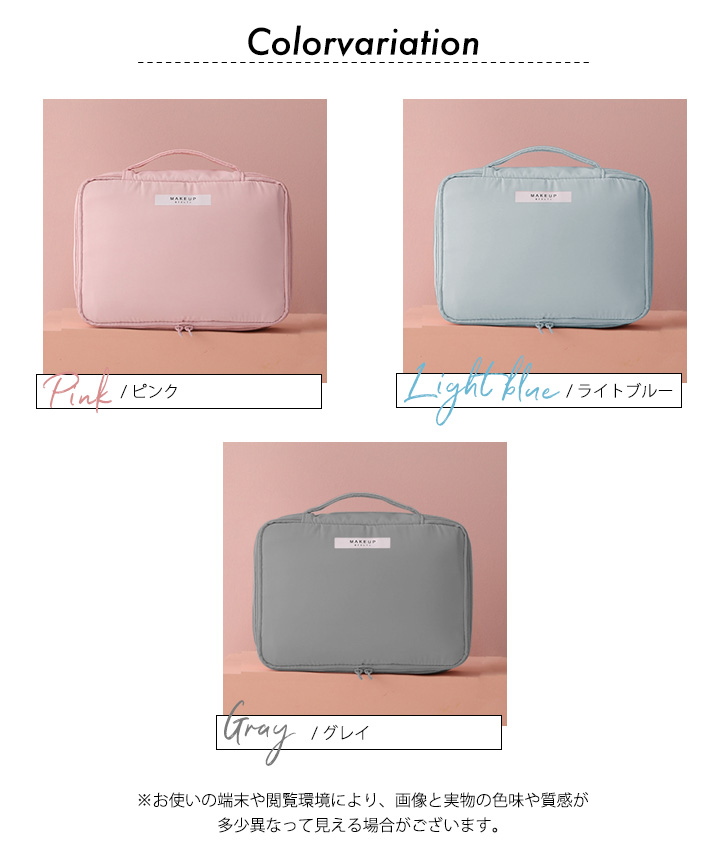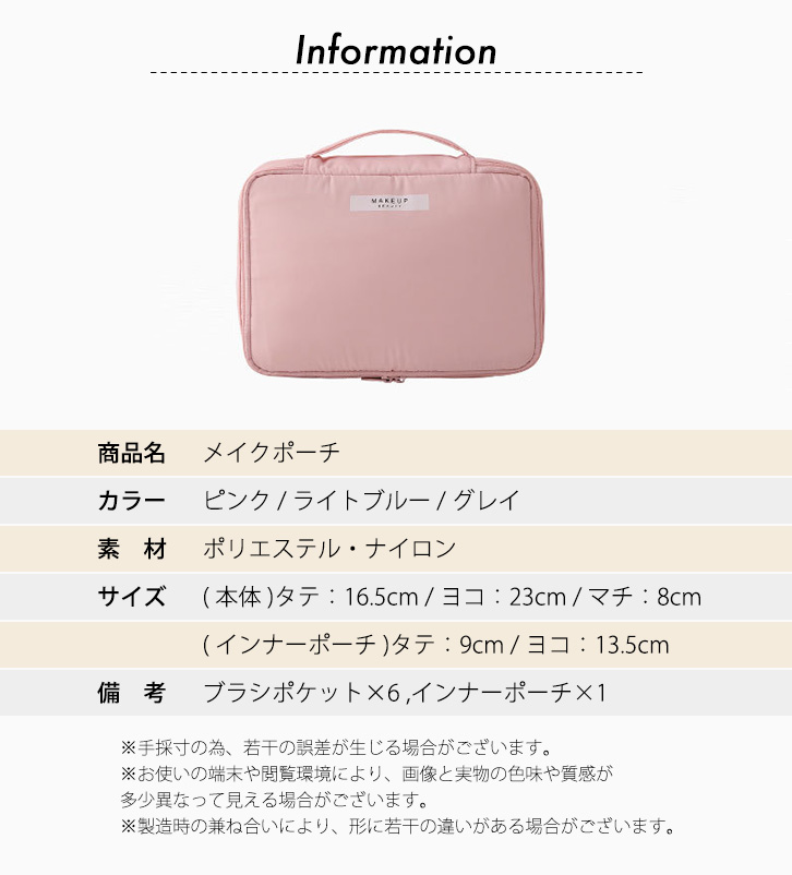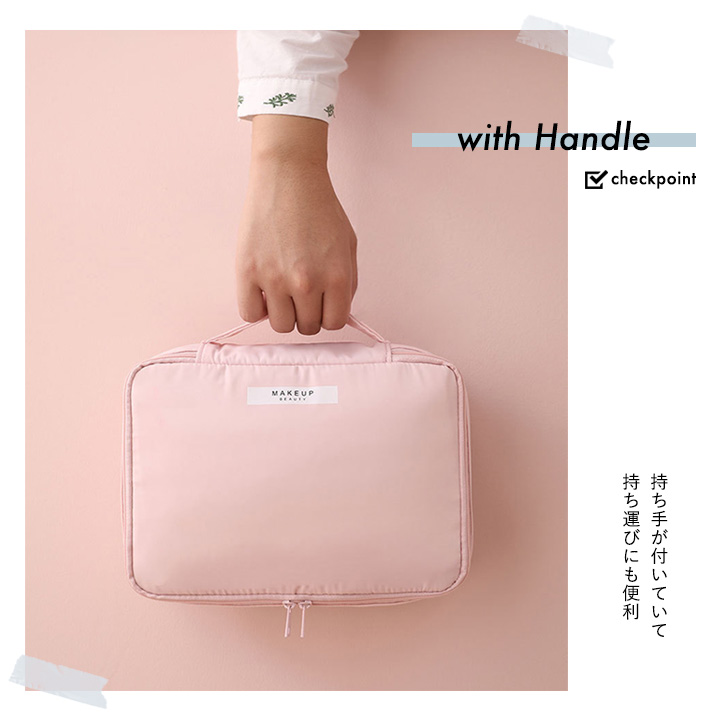 メイクポーチ コスメポーチ 化粧ポーチ シンプル 持ち手付き 収納力抜群 インナーポーチ ブラシポケット付き 旅行 出張 トラベル 持ち運び便利 ピンク ライトブルー グレイ ダブルファスナー開閉 持ち手 シンプルデザイン
