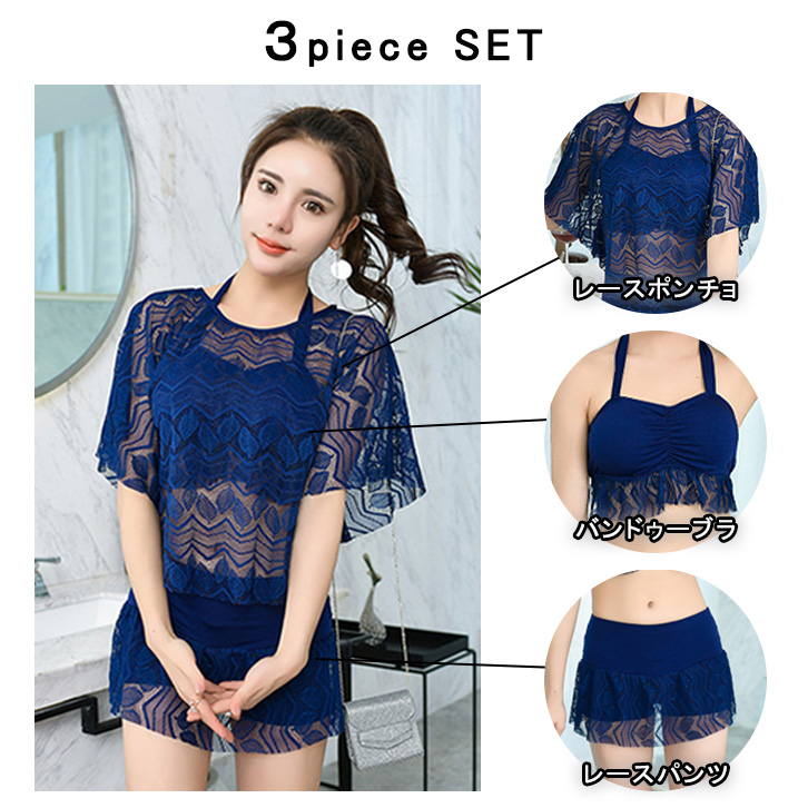 レディース 水着 3点セット フリル レース 水着 体型カバー チュニック付き 水着 体型カバー レース チュニック 3点セット 水着 体型カバー 水着 フリル レディース シンプル 20代 30代 体型カバー 水着 レース チュニック付き 小胸カバー
