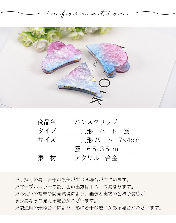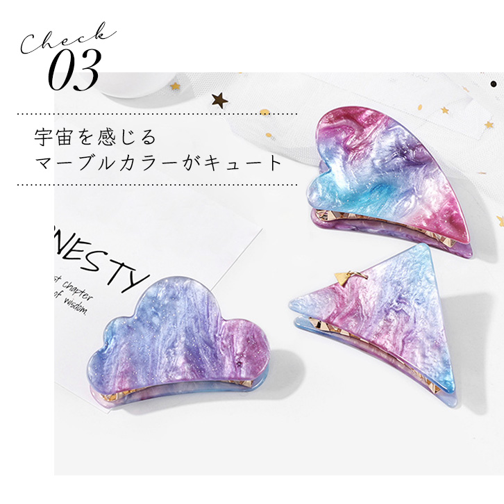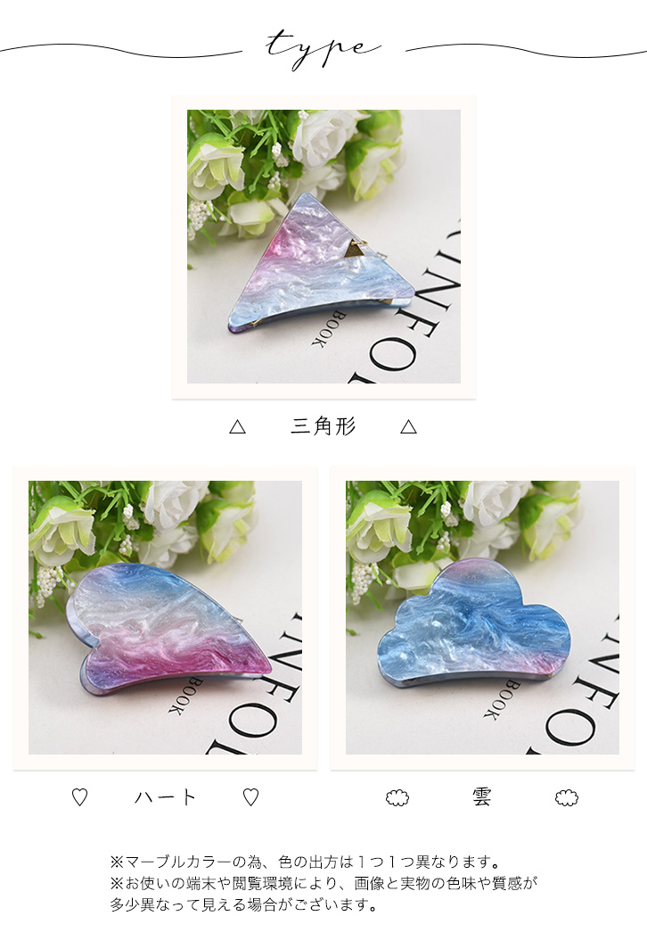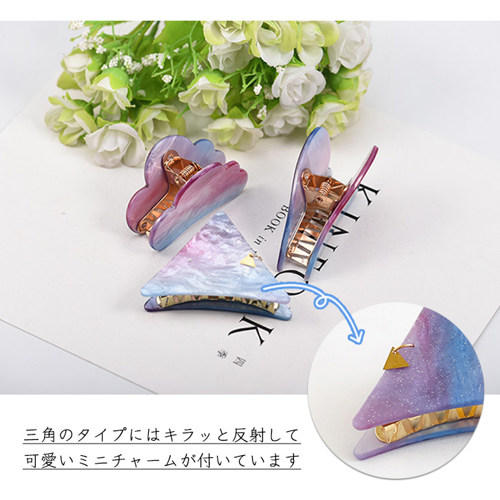 バンスクリップ ヘアクリップ クリップ ヘアアクセサリー ヘアアレンジ トレンド感 まとめ髪 マーブルカラー かわいい アクセント キュート 三角 ハート 雲 上品 大人かわいい 3タイプ ヘアアクセ 宇宙 おしゃれ きれい