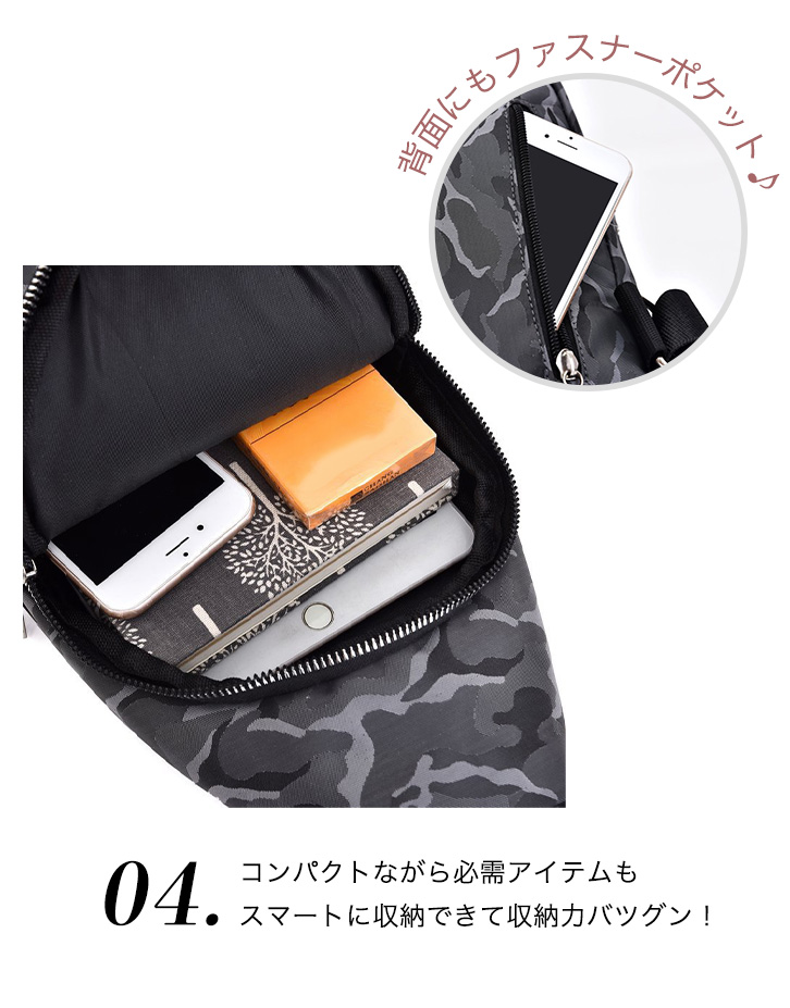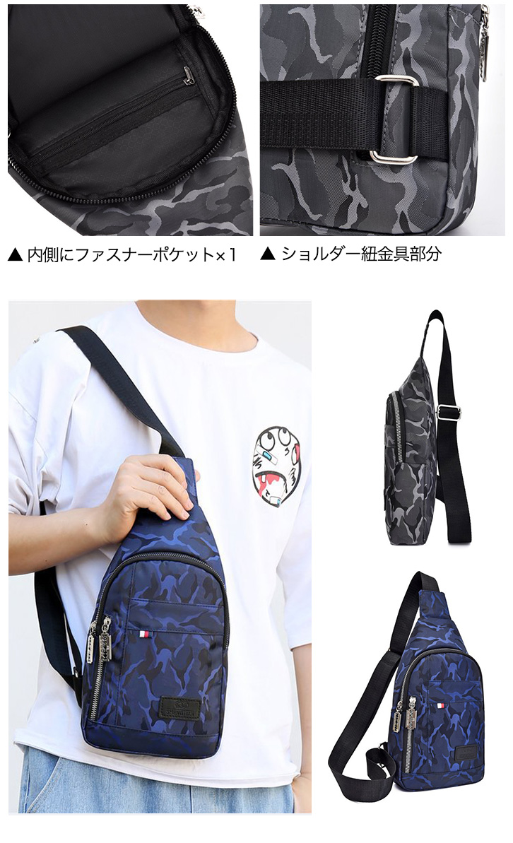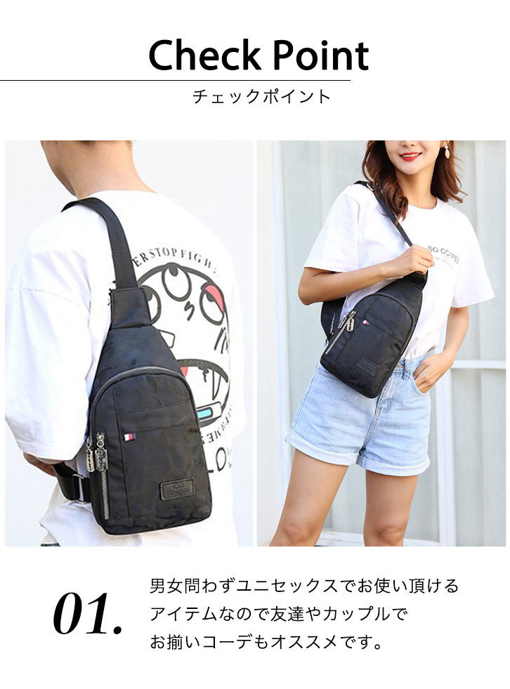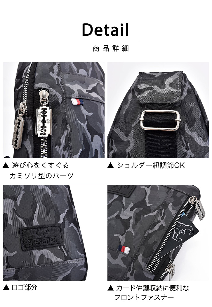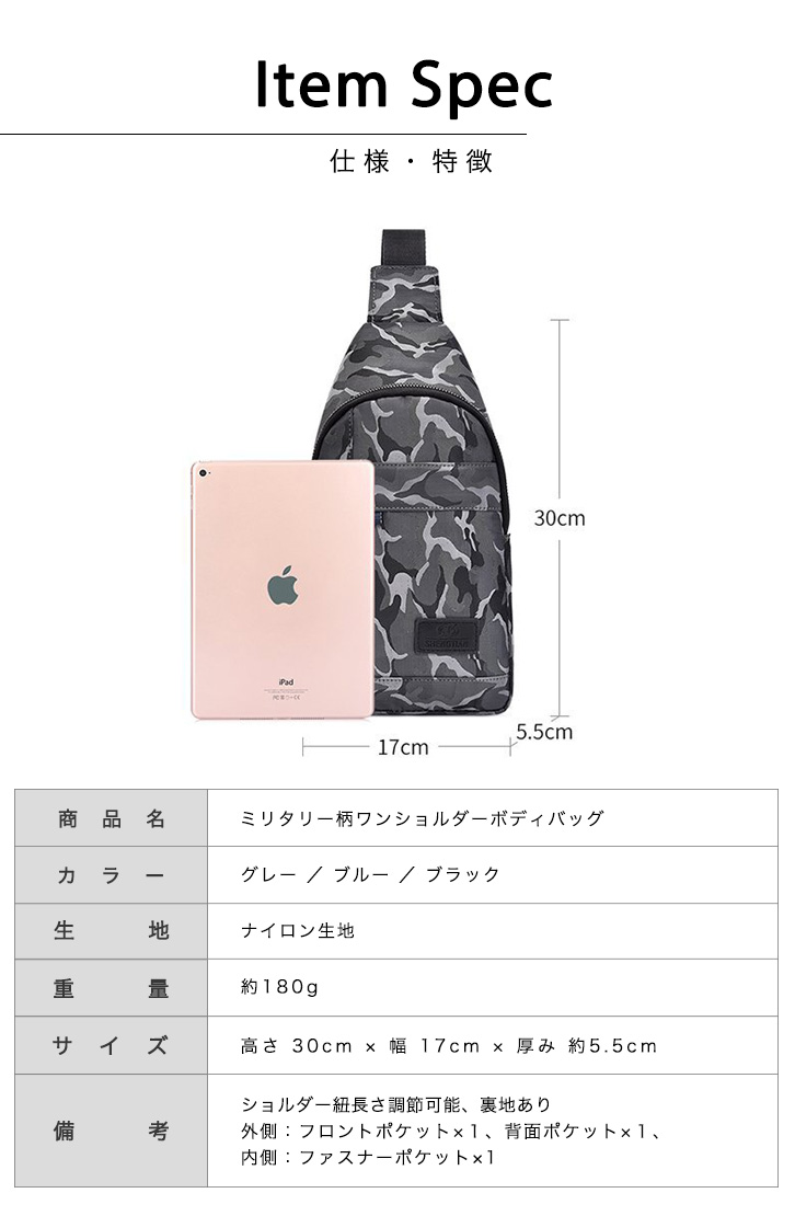 ボディーバッグ ワンショルダー 男女兼用 ユニセックス ミリタリー ミリタリーデザイン デイリー 収納力抜群 ショルダー長さ調節可能 軽量 丈夫 ナイロン素材 おしゃれ コンパクト フロントファスナーポケット 背面ファスナーポケット