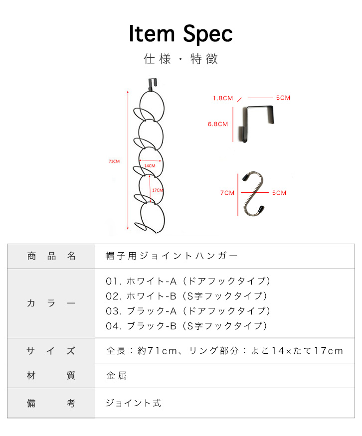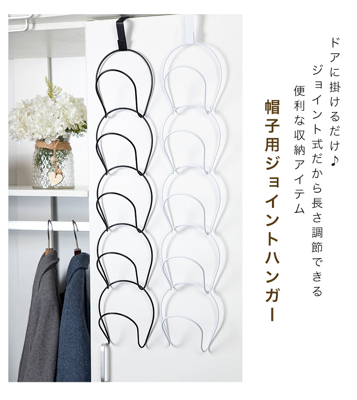 ハンガー 帽子用ハンガー 帽子用ジョイントハンガー ジョイント式 帽子 長さ調節可能 便利 収納 帽子収納 スカーフ 小物 雑貨 ネクタイ ストール 引っ掛ける ドア用フック A字フック ドア クローゼット キャップ ホワイト ブラック
