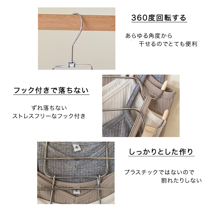 フック付きなので洋服がズレ落ちたりする心配もなく