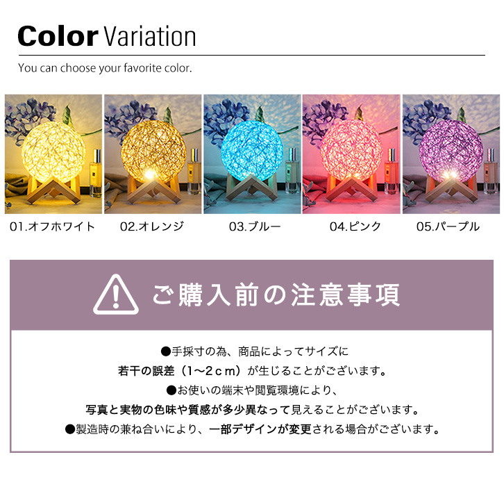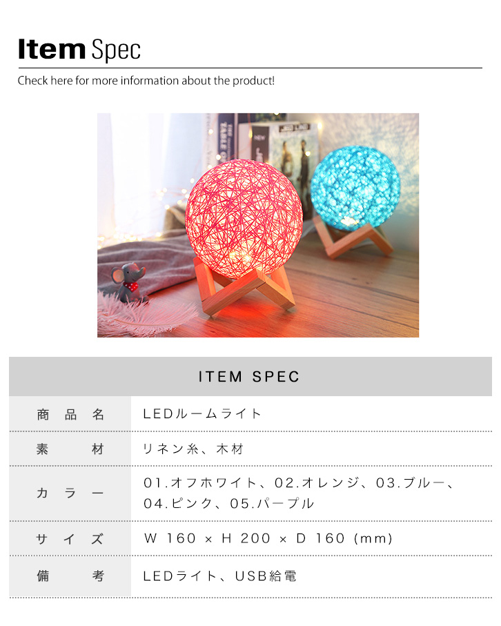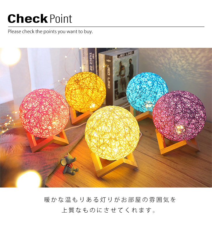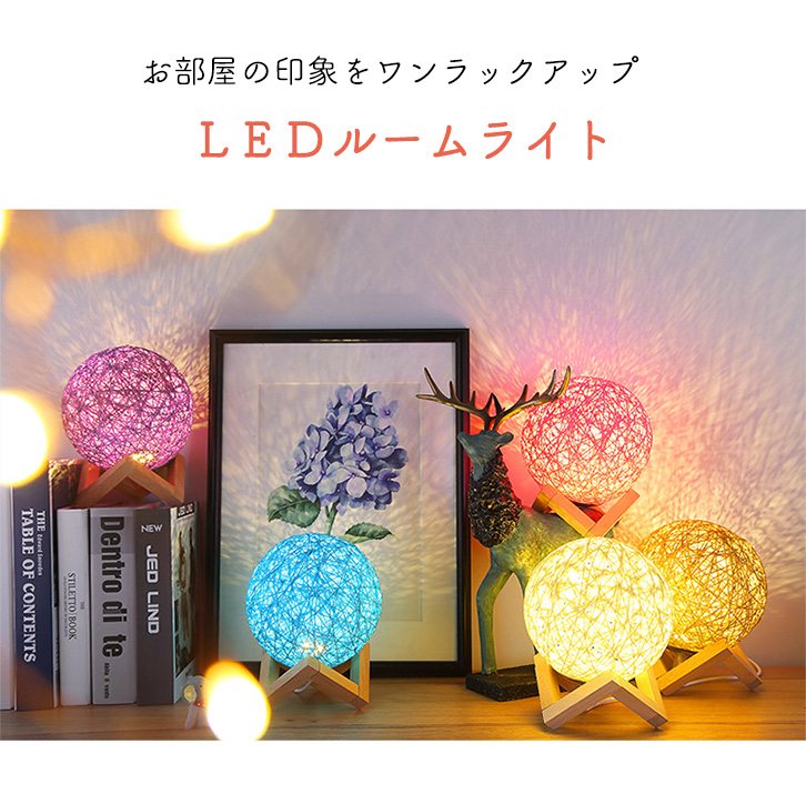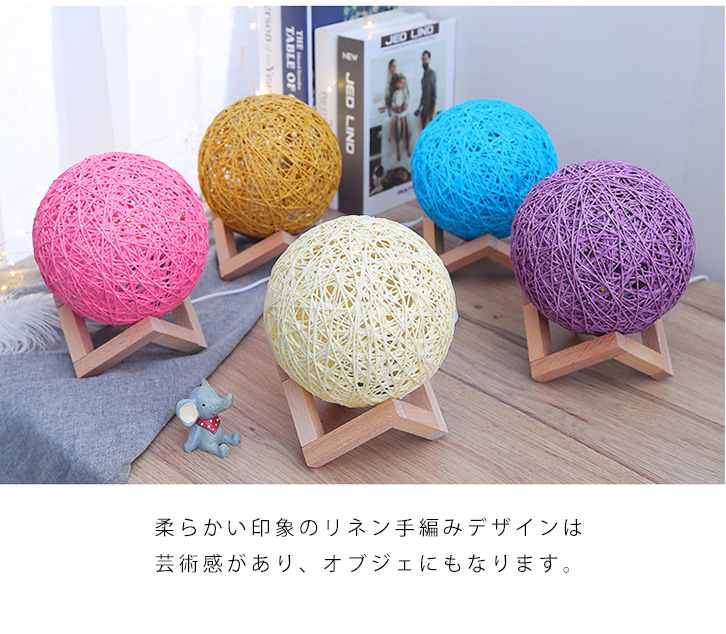 ルームライト ライト LEDライト 間接照明 USB給電 USB 省エネ LED エコ リネン手編み オブジェ インテリア おしゃれ かわいい 丸型 球 カラー豊富 カラーバリエーション オフホワイト オレンジ ブルー ピンク パープル