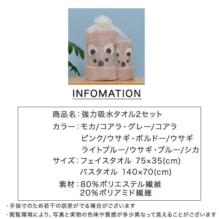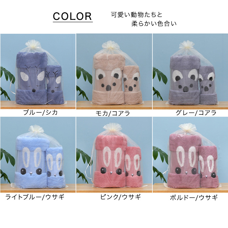タオル タオルセット バスタオル フェイスタオル 大小2セット セット アニマル かわいい 可愛い キュート 動物 シカ うさぎ コアラ 強力吸水 バス用品 肌触り抜群 アニマルタオル アニマルバスタオル アニマルフェイスタオル