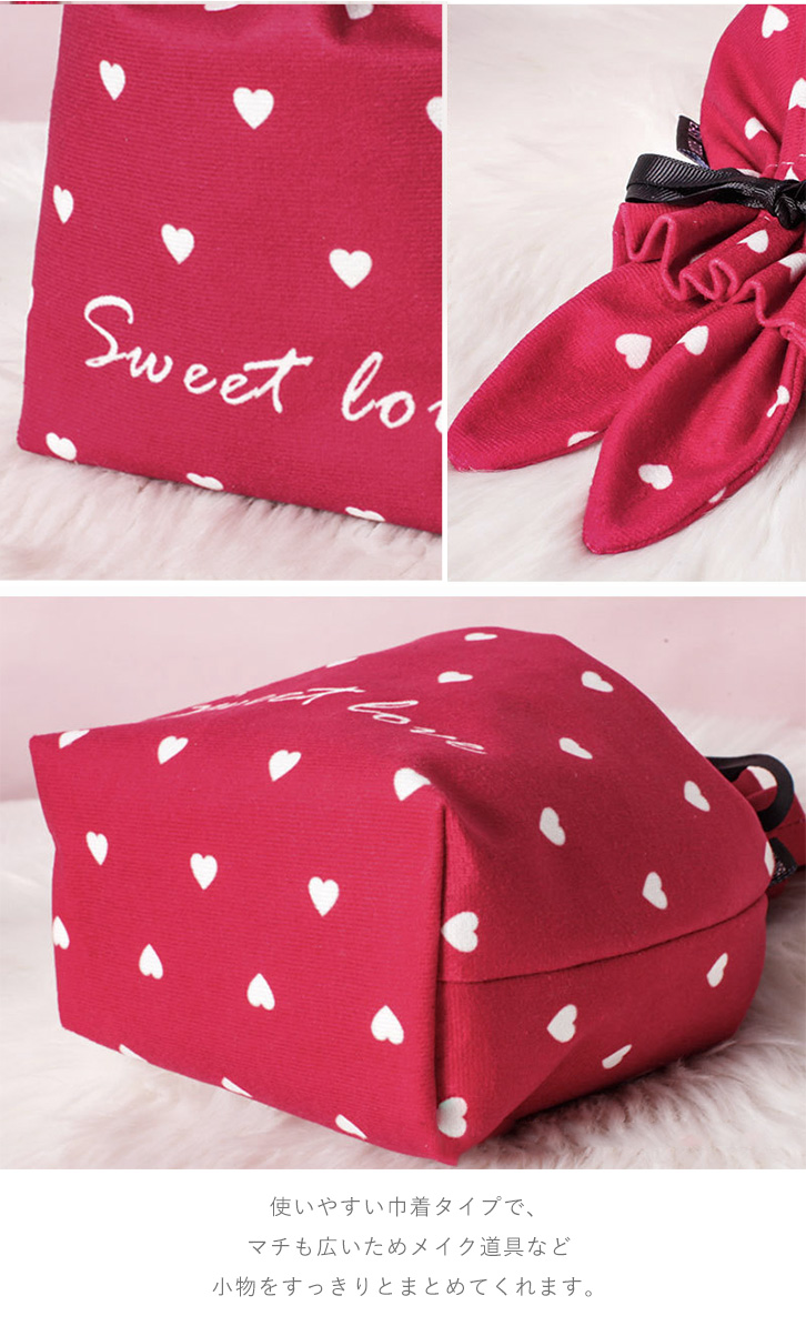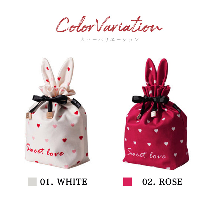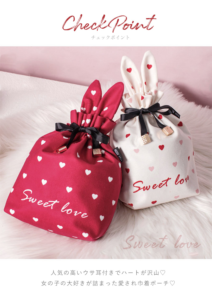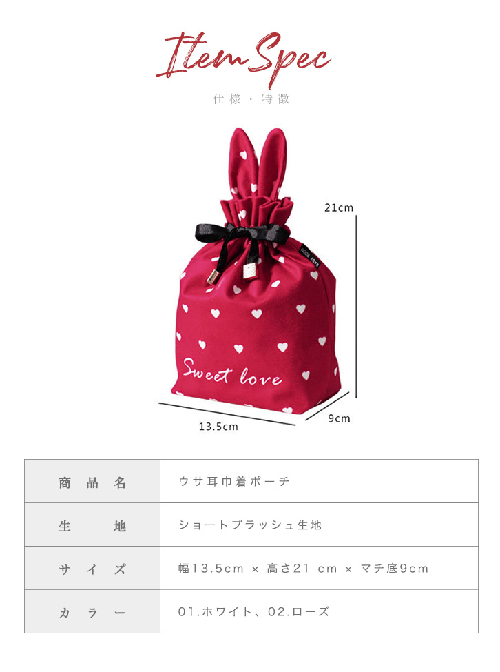 ポーチ レディースポーチ うさ耳ポーチ 小物入れ 多用途 トラベルポーチ サニタリーポーチ 巾着型 巾着型ポーチ 巾着ポーチ 可愛い うさ耳 リボン ハート デイリー 旅行 トラベル サニタリー ホワイト ローズ おしゃれ