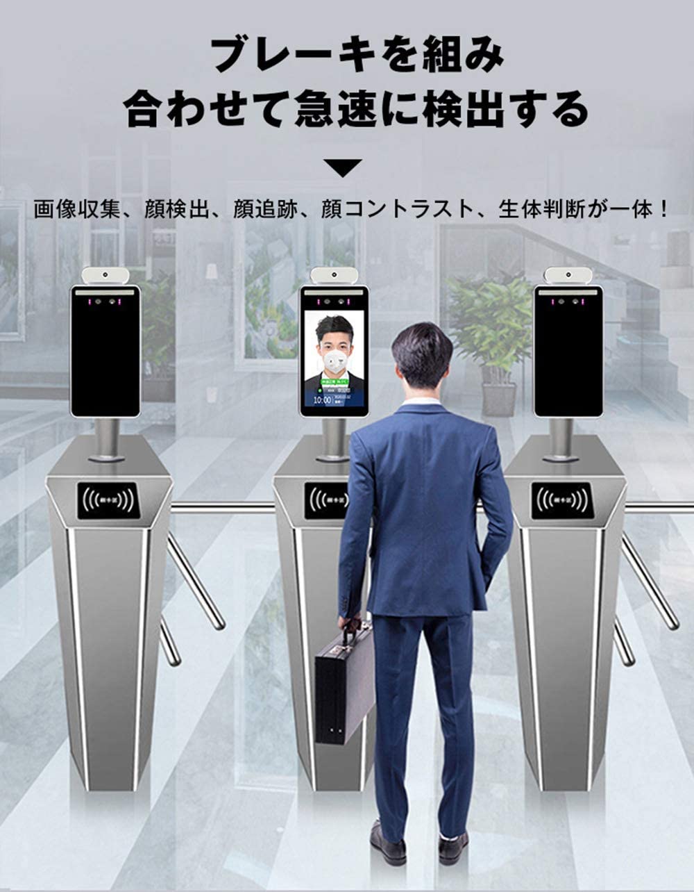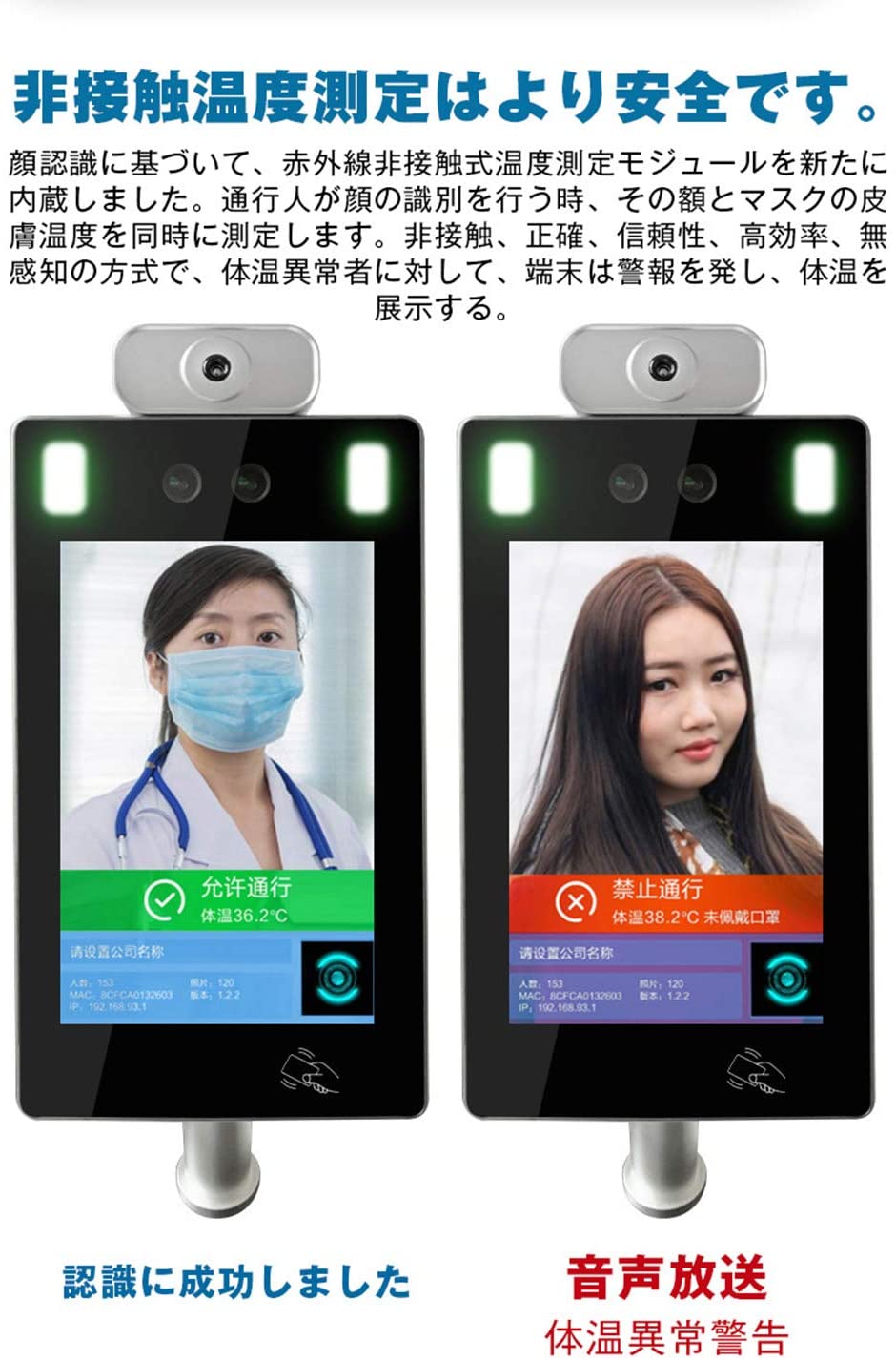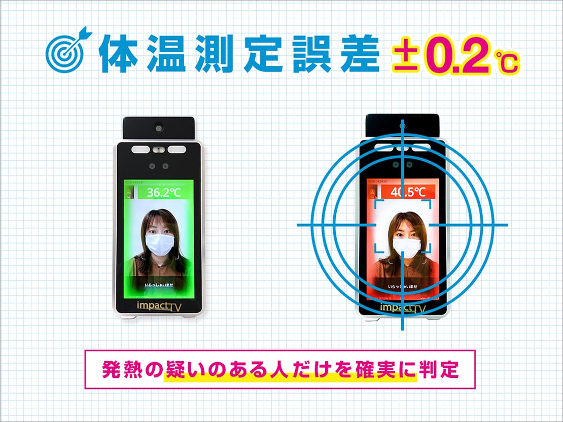 カメラの前に立つだけで、即座に温度を測定、マスク着用の有無をすばやく判定。