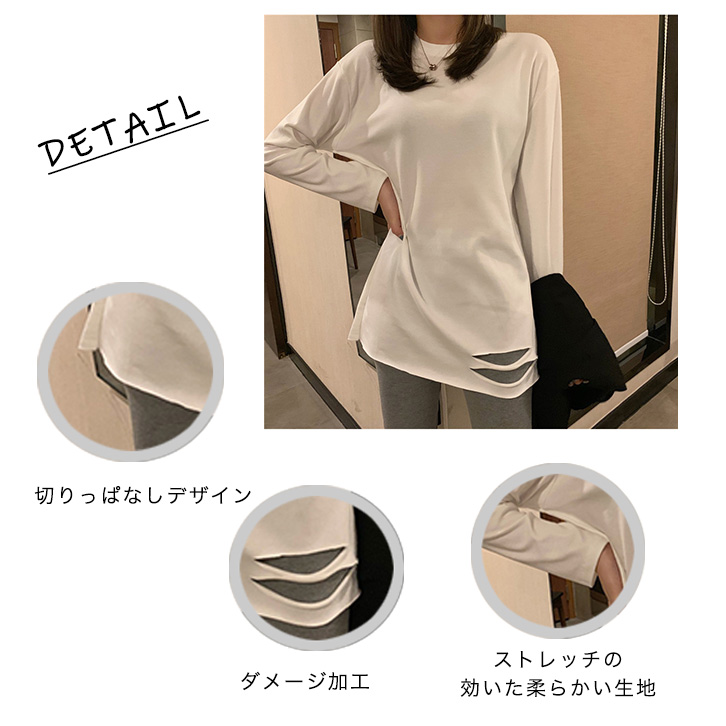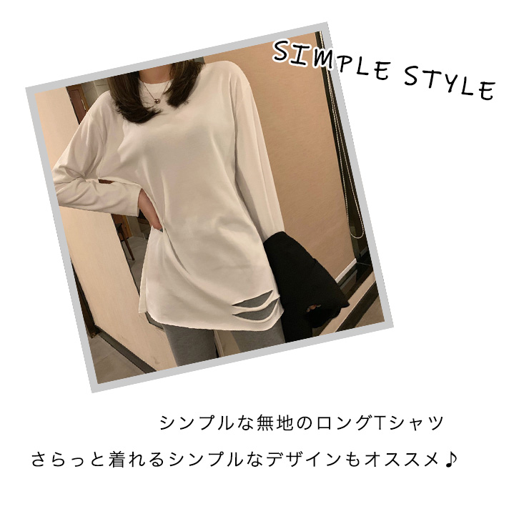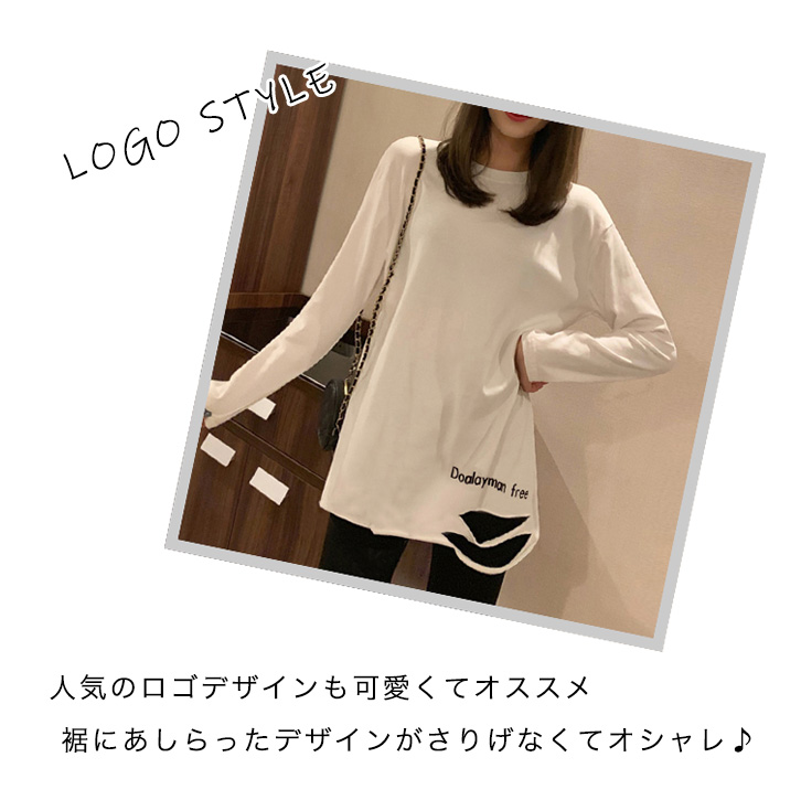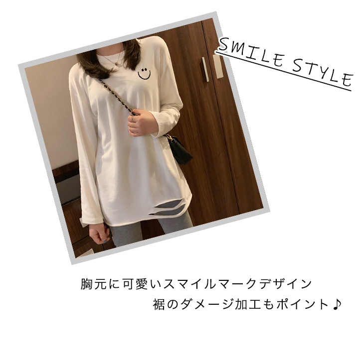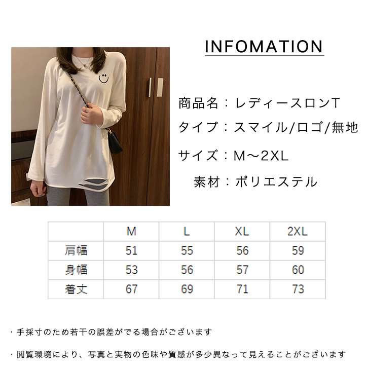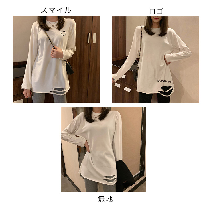 トップス ロンT 長袖 レディース ロングTシャツ かわいい おしゃれ シンプル カジュアル ホワイト 合わせやすい 着回し抜群 デイリー スマイル ロゴ入り 無地 タイプ豊富 ダメージ加工 ストレッチ性抜群