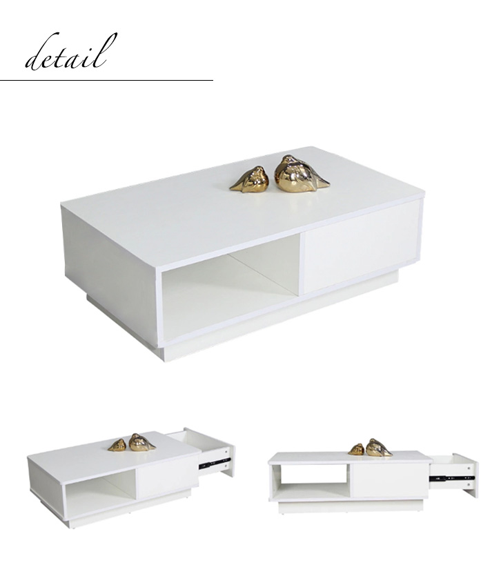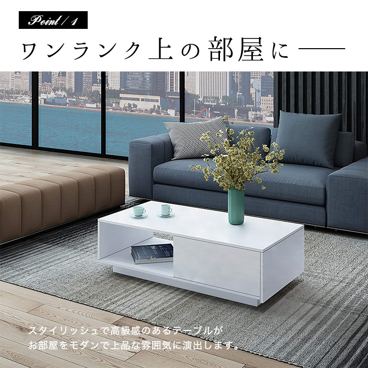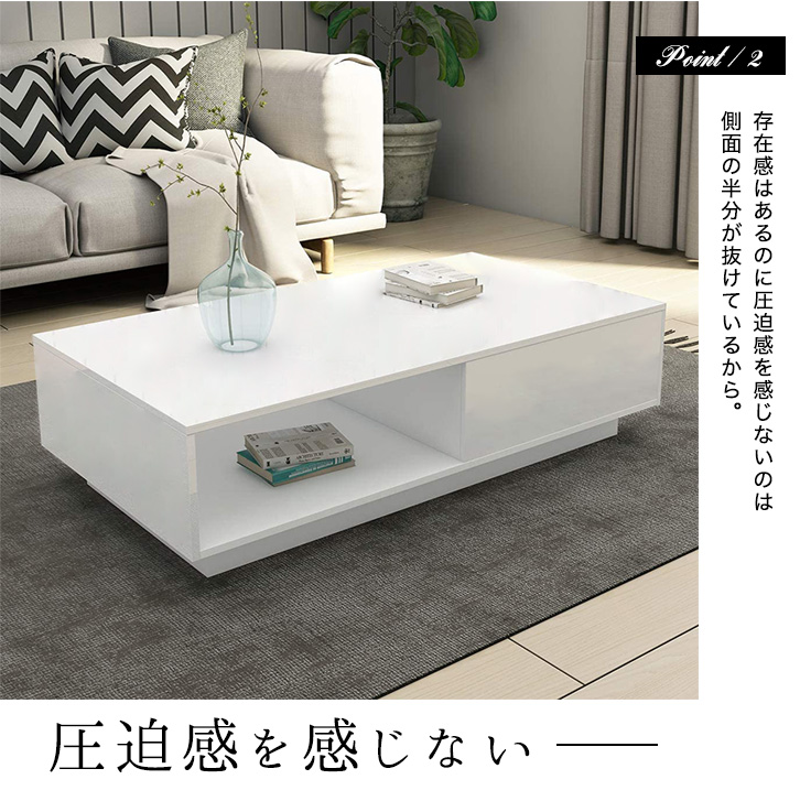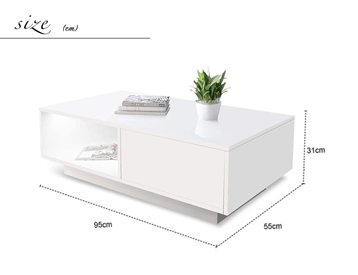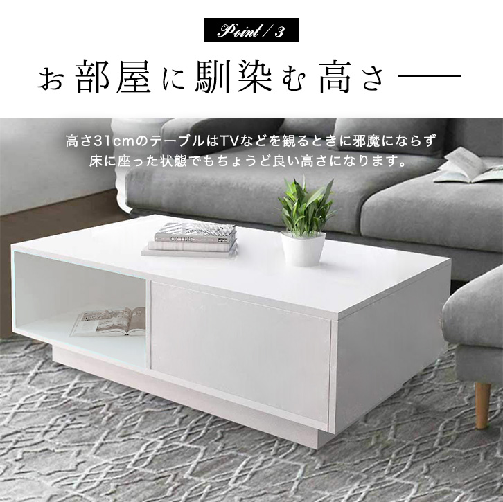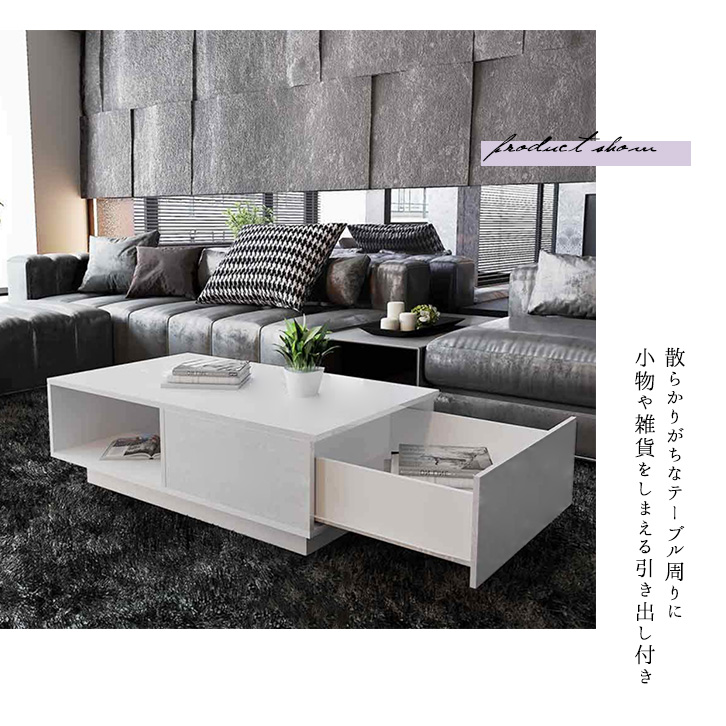 テーブル ローテーブル センターテーブル リビングテーブル ホワイト 白 長方形 コーヒーテーブル 幅95cm 高さ31cm 奥行55cm 引き出し付き 引き出し table スタイリッシュ モダン 上品 高級感 収納付き 収納力抜群 オープン収納 新生活 シンプル おしゃれ 読書 作業机