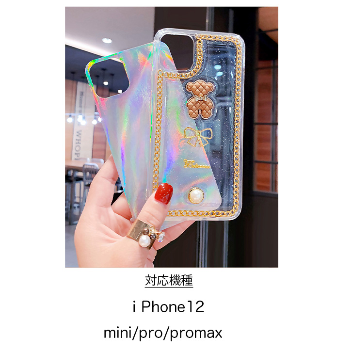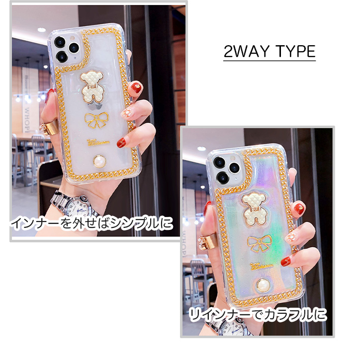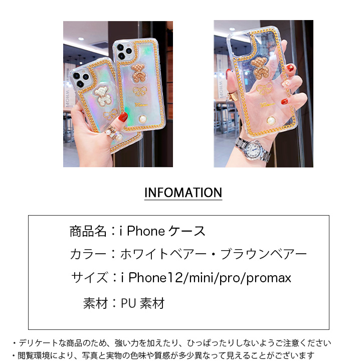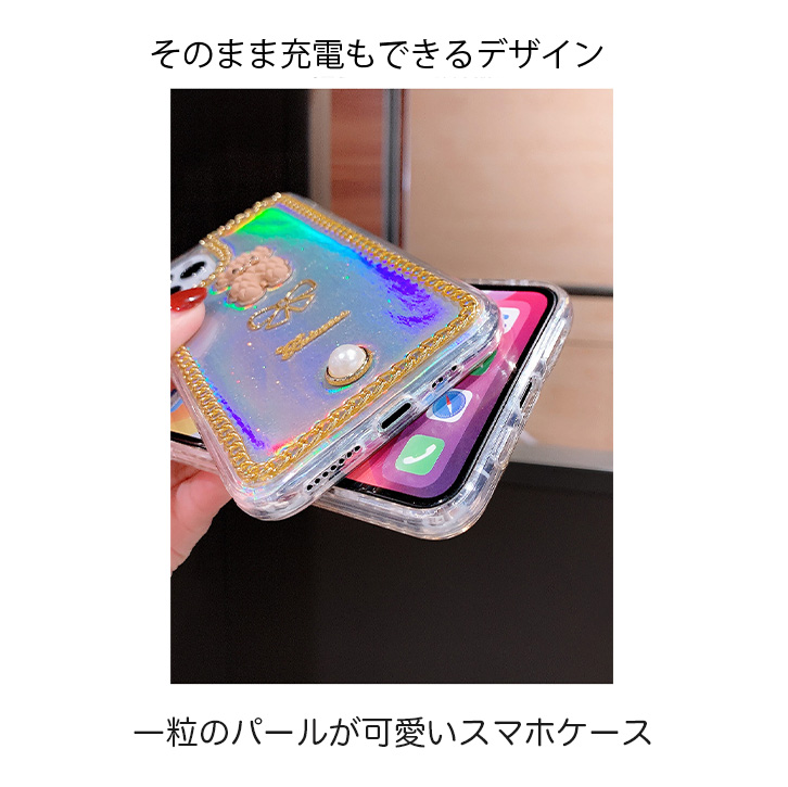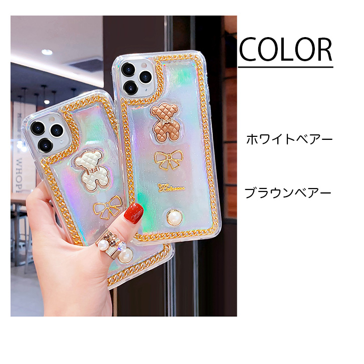 iPhoneケース iPhoneカバー iPhone iPhone12 iPhone12mini iPhone12pro iPhone12promax オーロラケース クリアケース クマ くまちゃん かわいい リボン チェーン パール 可愛い フェミニン ホワイト ブラウン