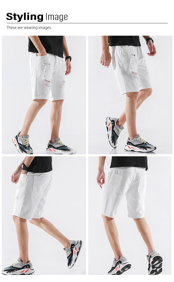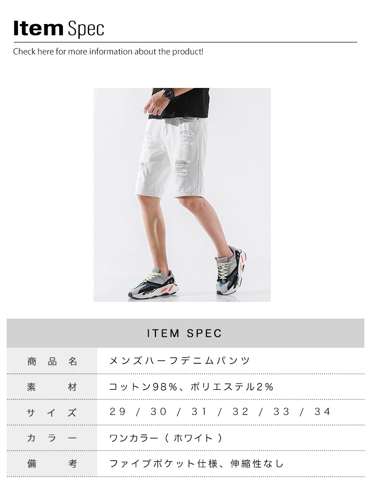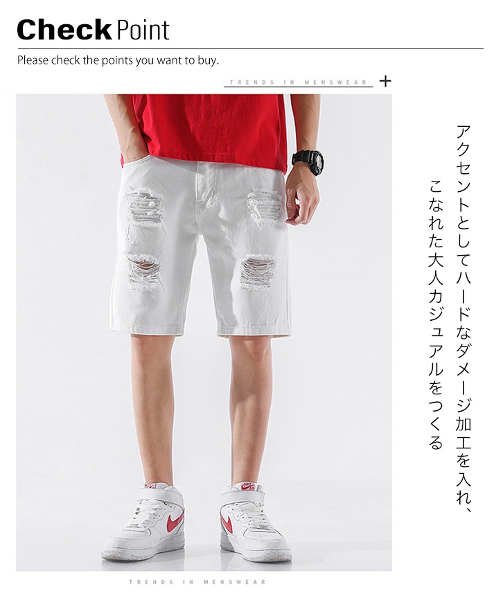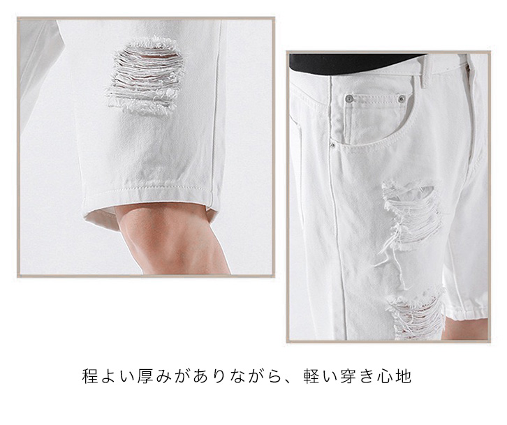 ボトム ハーフパンツ メンズ ハーフデニムパンツ ハーフデニム デニム ダメージ加工 膝丈 メンズパンツ ハーフメンズパンツ サイズ豊富 おしゃれ かっこいい 大人カジュアル 着回し抜群 シンプル 合わせやすい ホワイト