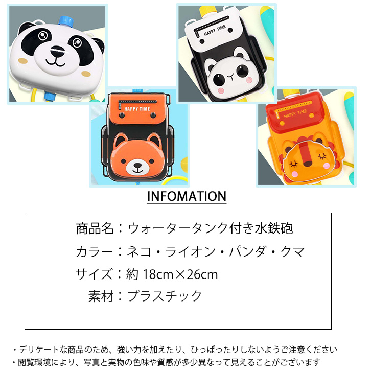 水鉄砲 リュック型水鉄砲 リュック型 水てっぽう ウォーターガン アニマル 動物 かわいい 水遊び プール 海 ビーチ ライオン パンダ クマ ネコ 可愛い キュート 夏 楽しい ウォータータンク付き タンク付き 男の子 女の子 おもちゃ