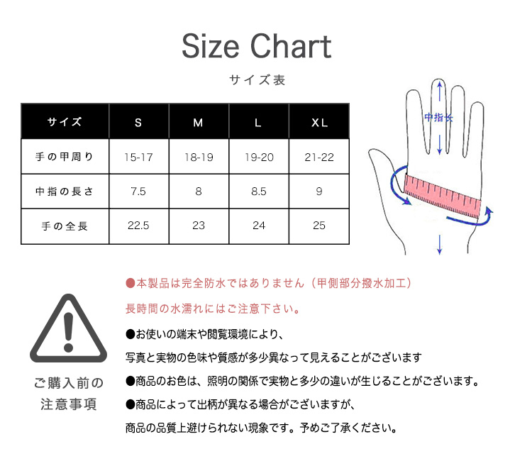 Sサイズ/手の甲周り15~17cm、中指長さ7.5cm、手の全長22.5cm