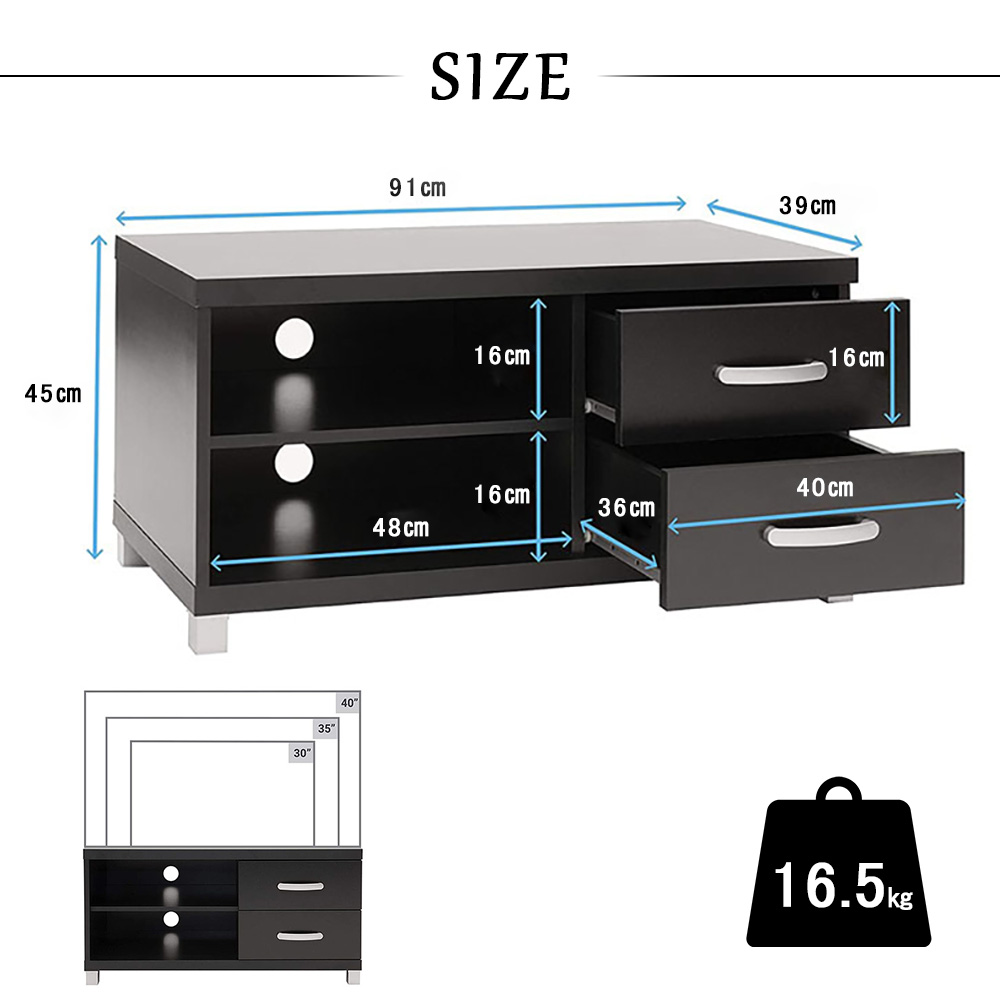 幅91cmで最大40インチのテレビを置くことができるので