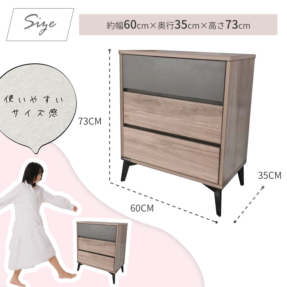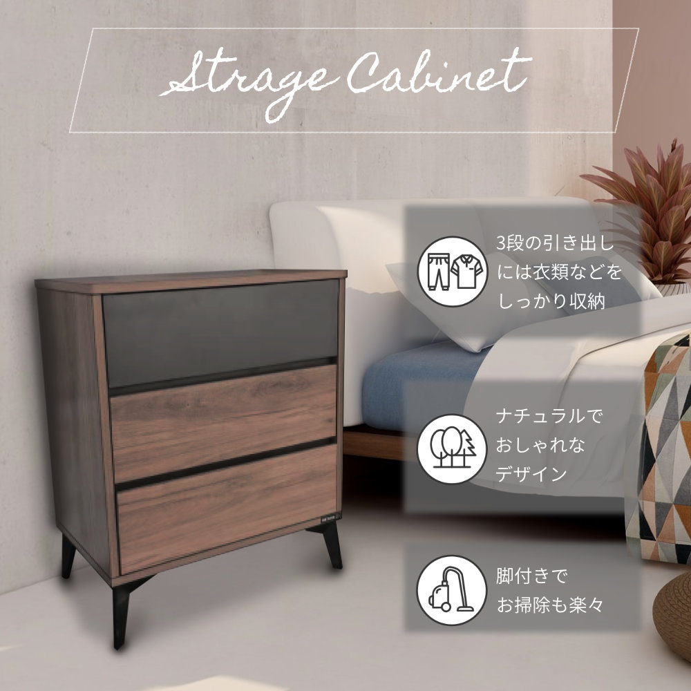 キャビネット 収納キャビネット チェスト 木製 サイドボード リビングボード収納棚 棚 3段 3段キャビネット 幅60cm 高さ37cm 奥行35cm 脚付 収納 おしゃれ 引き出し サイドチェスト 引出し リビング 寝室 シンプル ナチュラル ブラウン