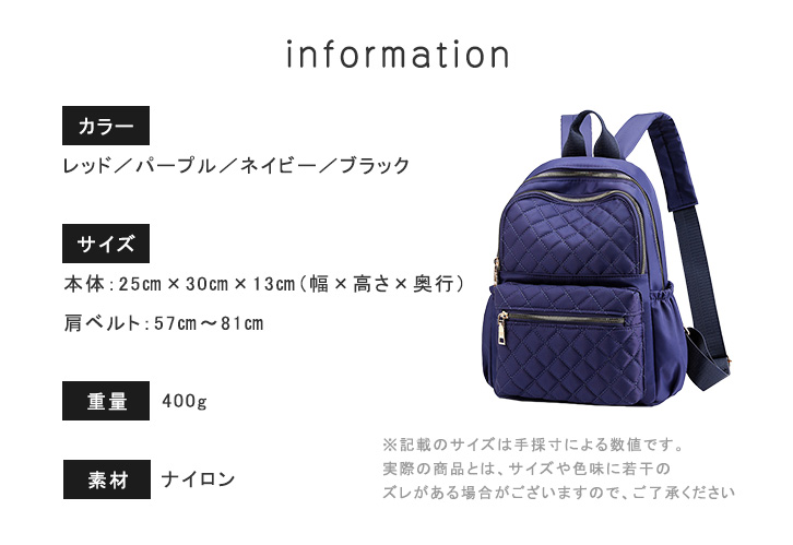 リュック バックパック レディース キルティング 大容量 レディースリュック リュックサック デイリー使い アウトドア かわいい おしゃれ 全4カラー 防水加工 通気性抜群 ファスナー開閉 旅行 レッド パープル ネイビー ブラック