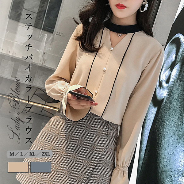 ブラウス レディース 長袖 シフォンブラウス ステッチバイカラーブラウス パールボタン ガーリー フェミニン かわいい キュート 裾フリル 大人かわいい 上品 エレガント とろみ素材 とろみ ベージュ グレー きれいめ シフォン 着心地抜群
