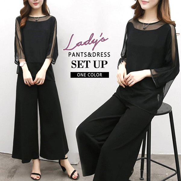 セットアップ レディース 秋冬 長袖 上下セット シースルー 大人可愛い パンツドレスセットアップ ワイドパンツ ウエストゴム 着心地抜群 快適 動きやすい シンプル セクシー おしゃれ きれいめスタイル フォーマル ブラック
