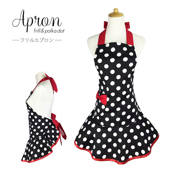 エプロン フリルエプロン かわいい おしゃれ ドット 水玉 水玉エプロン ドットエプロン ホルターネック オシャレ 可愛い キュート リボンポケット付き キッチン 家事 着心地抜群 リボン フレア裾 フレア ギフト フリル フリーサイズ