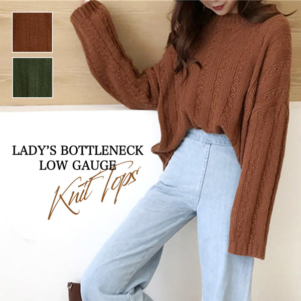 ニット トップス セーター レディース 長袖 秋 冬 春 ボトルネック ローゲージニット シンプル 着回し抜群 合わせやすい 大人カジュアル 大人かわいい ゆるっとシルエット ドロップショルダー あったか 無地 テラコッタ グリーン