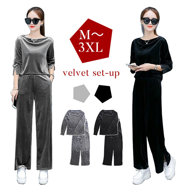 セットアップ 長袖 長ズボン 上下セット ベルベット ルームウェア 部屋着 パジャマ ナイトウェア 光沢感 着心地抜群 グレー ブラック ボートネック スリット入り ウエストゴム らくちん 履きやすい サイズ豊富 全2カラー