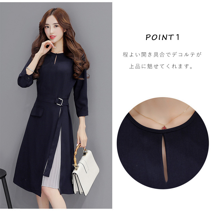 ワンピース レディース 七分袖 ネイビー ワンカラー オシャレ スリットプリーツ 着痩せ効果 上品 大人かわいい 美シルエット エレガント プリーツ オールシーズン 結婚式 パーティードレス おしゃれ シンプル きれいめ