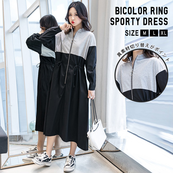 ワンピース 長袖 ミモレ丈 バイカラー 切り替え スポーティー ロング丈 ワンピ スポーティーワンピース おしゃれ シンプル 両サイドポケット リング付きジッパー らくちん カジュアル オシャレ グレー ブラック 異素材切り替え ウエストドローコード