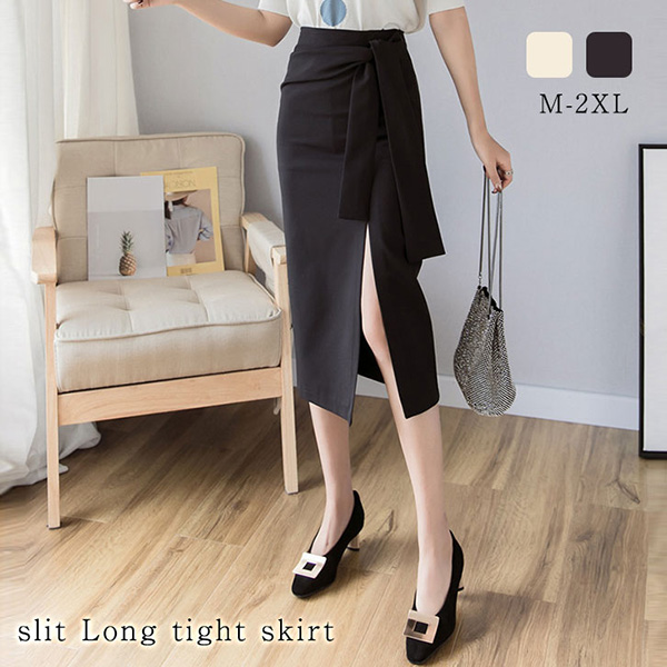 スカート レディーススカート タイトスカート スリット セクシー ハイウエスト 美ライン ざっくりスリット 大人キレイ 上品 女子力 おしゃれ ジッパー付き 着脱楽々 リボン オフホワイト ブラック
