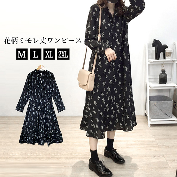 ワンピース 長袖 レディース レディースワンピース フレアワンピース レディースワンピ 春 秋 ロングシーズン 膝下丈 ミモレ丈 おしゃれ 可愛い フェミニン 花柄 花 レトロ カジュアル 着回し抜群 シンプル ブラック 大人かわいい