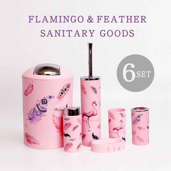 サニタリーグッズ サニタリーセット 6点セット フラミンゴ柄 フェザー柄 ピンク 洗面用品 ディスペンサー 歯ブラシスタンド ソープディッシュ ダストボックス フリースタンド トイレブラシホルダー