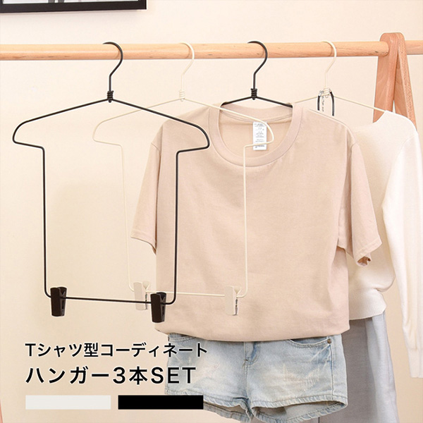 ハンガー 衣類ハンガー コーディネートハンガー 3個セット トップス ボトムス クリップ付きハンガー 省スペース 便利 スライド式クリップ付き コーディネート用ハンガー Tシャツ型 アイボリー ブラック 同色3個セット 収納 上下収納 上下セット