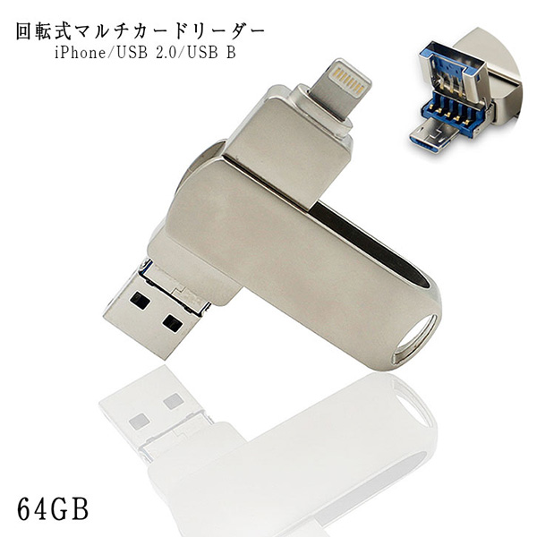 フラッシュメモリ 64G USB ライトニング USBメモリ ステンレス 回転式マルチカードリーダー シルバー 高速データ通信 【64G】