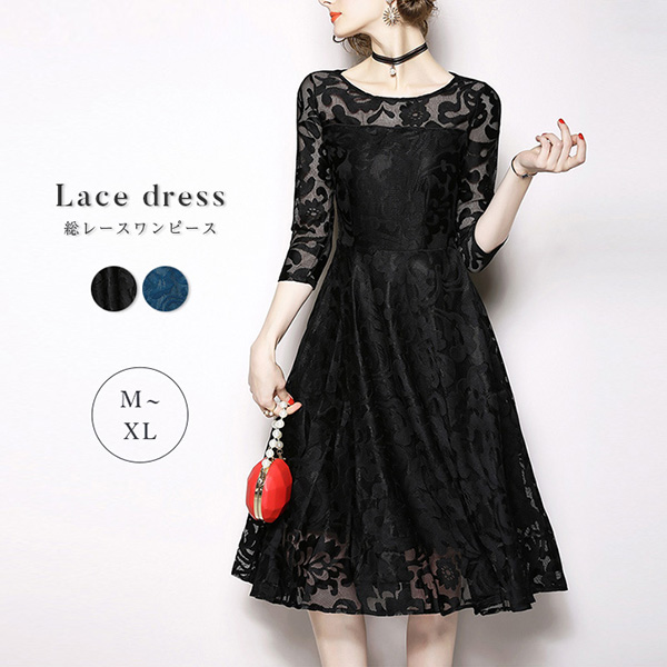 ワンピース ドレス レディース 黒 秋 七分袖 膝丈 膝下 総レース 総レースワンピース ワンピ フレア 美シルエット おしゃれ 可愛い 結婚式 パーティー コンシールファスナー 上品 キレイめ 大人可愛い ブラック ピーコックブルー