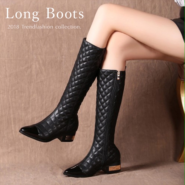 ロングブーツ ハイチューブレザーブリティッシュ風 秋 冬 2018モデル ゴールド金具 ナイトブーツ レディース 女性 レザー ローヒール サイズ38(23.5~24センチ)