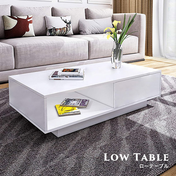 テーブル ローテーブル センターテーブル リビングテーブル ホワイト 白 長方形 コーヒーテーブル 幅95cm 高さ31cm 奥行55cm 引き出し付き 引き出し table スタイリッシュ モダン 上品 高級感 収納付き 収納力抜群 オープン収納 新生活 シンプル おしゃれ 読書 作業机