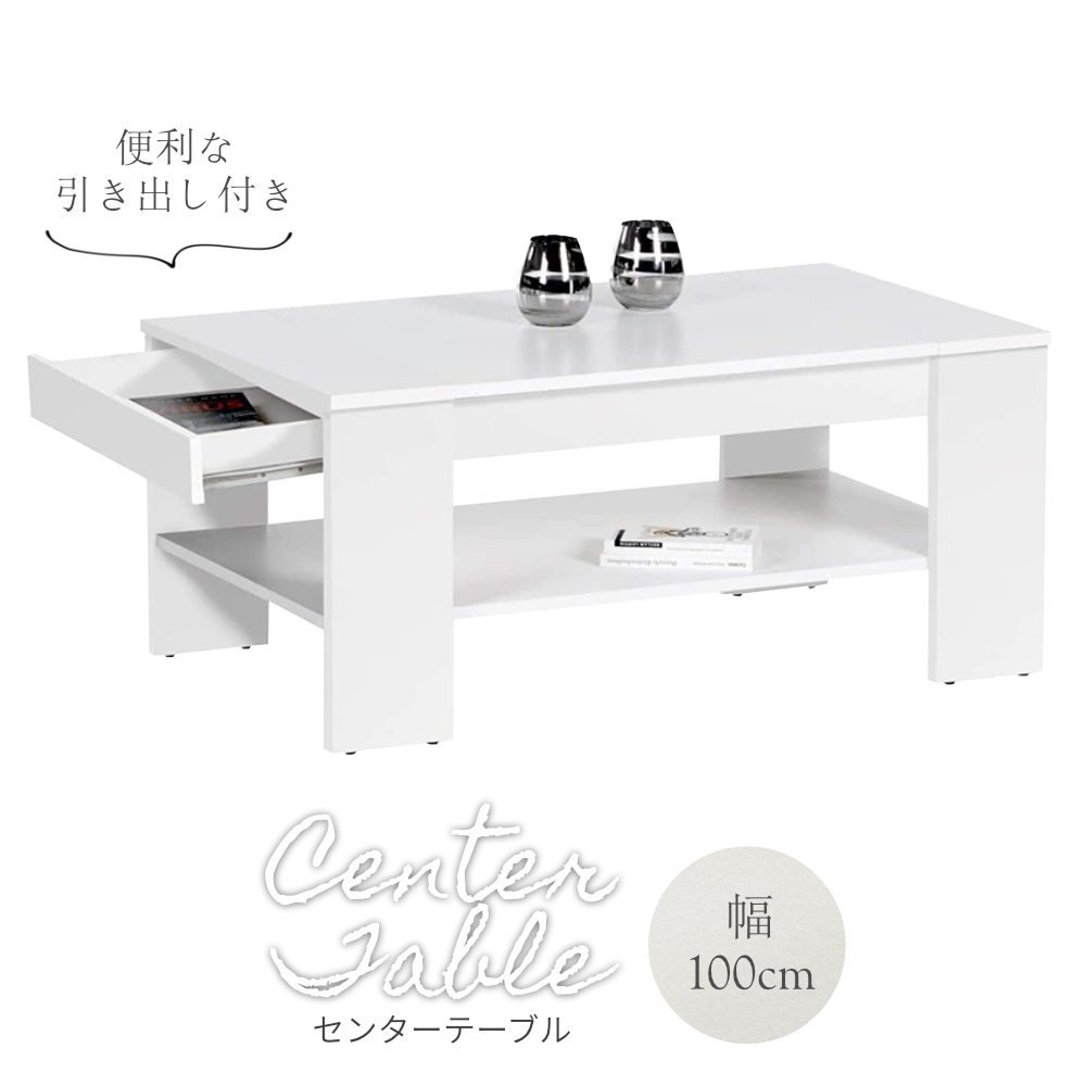 テーブル センターテーブル ローテーブル リビングテーブル ホワイト 白 北欧風 シンプル ナチュラル 幅100cm 高さ44cm 奥行58cm 収納棚 木製 引き出し収納 作業机 読書 PC作業 リモートワーク 在宅 読書 機能性 実用性