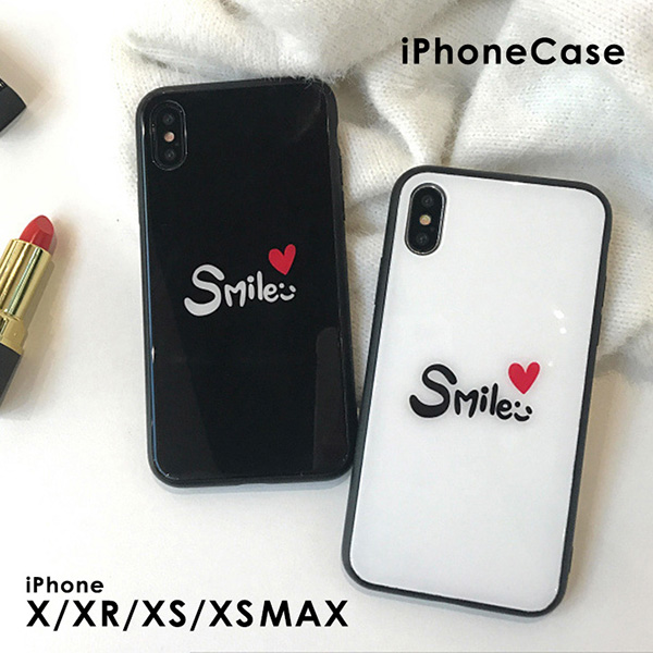 iPhoneケース アイフォン ケース カバー iPhoneカバー アイフォンケース シンプル スマイルロゴ ブラック ホワイト かわいい TPU 強化ガラス iPhoneXS iPhoneXR iPhoneXSMAX ストライプホルダー付き