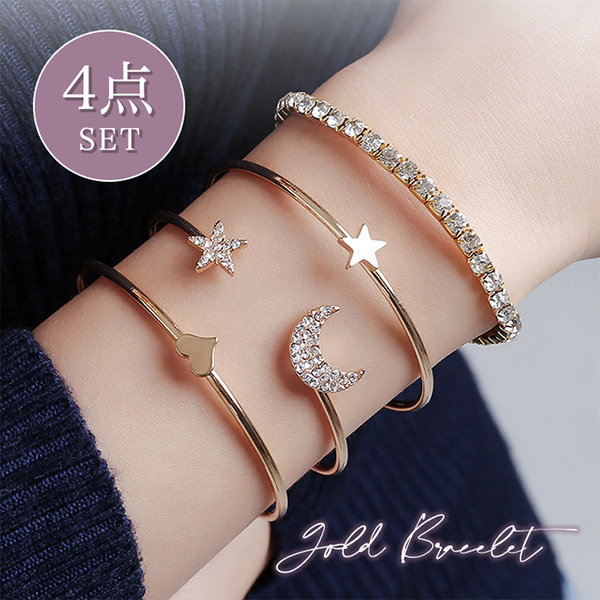 ブレスレット レディース セット 4点セット ゴールドブレスレット ラインストーン 4点 ゴールド きらきら バングル ハート 星 月 スター ムーン キラキラ シンプル ゴージャス モチーフ おしゃれ 可愛い きれい 合わせやすい