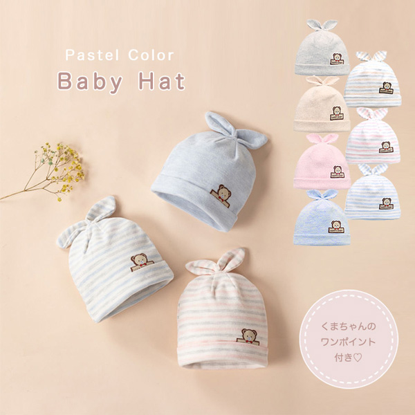 帽子 ベビー帽子 オールシーズン かわいい コットン 肌触り抜群 くまちゃん ワンポイント パステルカラー カラー豊富 カラーバリエーション 男の子 女の子 耳付き ボーダー 無地 キャップ ハット ふんわり 軽い 肌触り快適