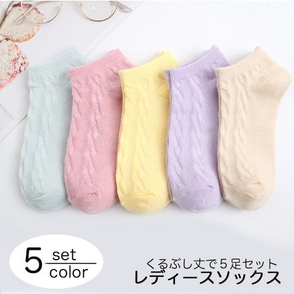 靴下 ソックス レディース くるぶし丈 パステルカラー 編み込み風 通気性抜群 5足1セット シンプル 無地 かわいい 丈夫 スニーカー コットン おしゃれ デイリー 洗い替え 履き心地抜群 カジュアル